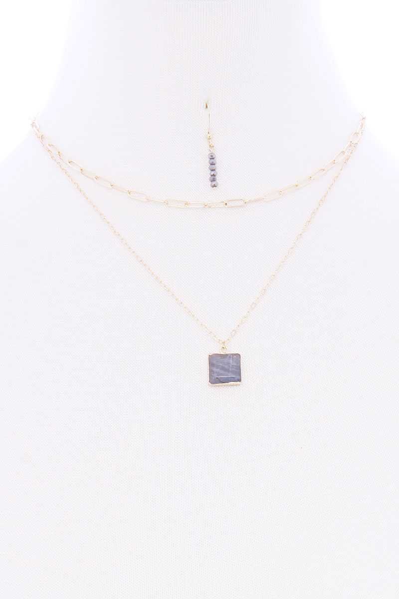 2 Layered Chain Metal Square Marbling Stone Pendant Necklace