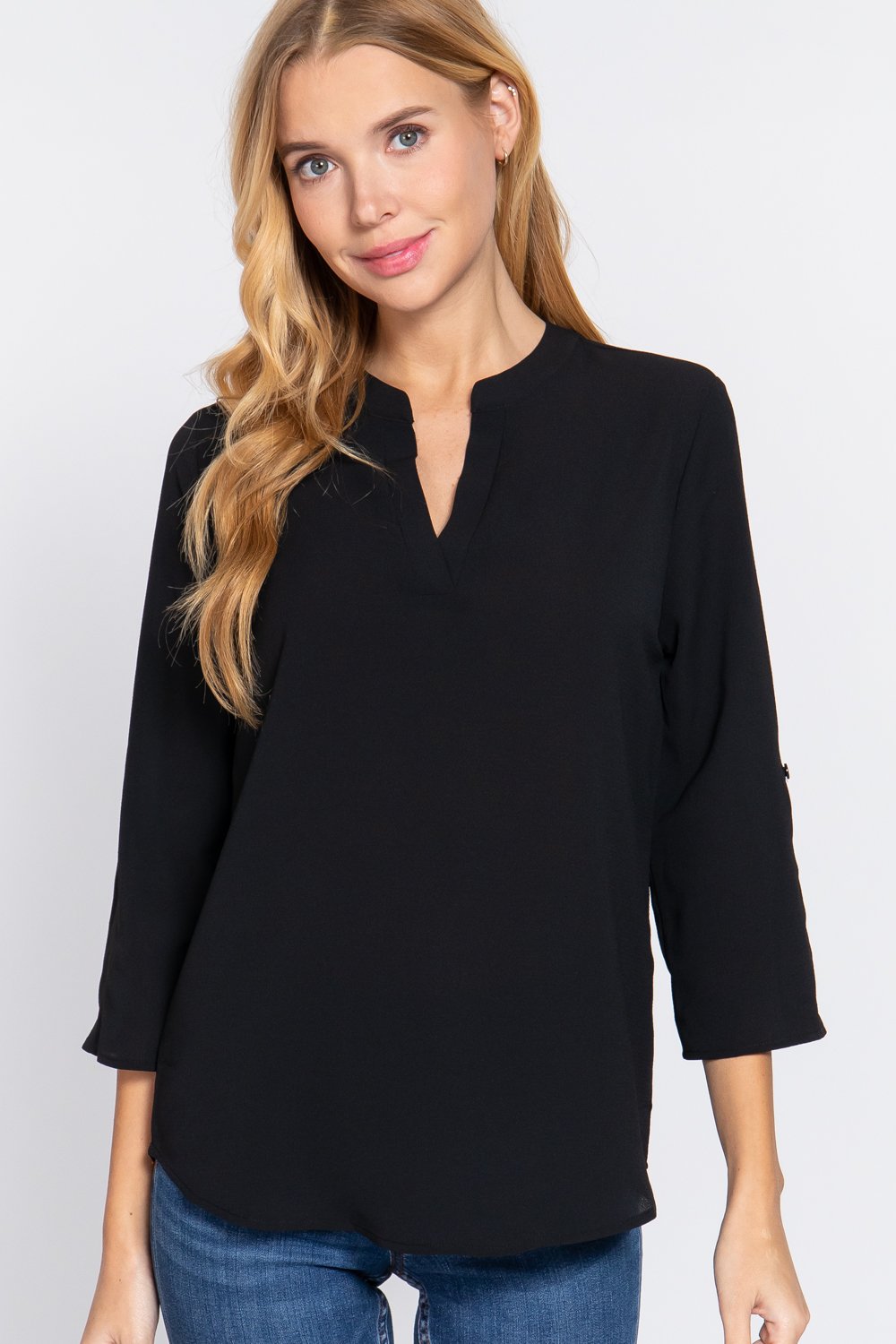 Introducing our sophisticated 3/4 Roll Up Sleeve V-Neck Woven Blouse—a versatile and chic addition to your wardrobe, perfect for creating polished and effortlessly stylish looks.Key Features:1. Sizes: Choose from our range of sizes, including S, M, and L, for a perfect fit that complements your individual style.2. Design: Embrace the timeless elegance of a 3/4 roll-up sleeve V-neck woven blouse. The V-neck adds a touch of femininity, while the roll-up sleeves provide versatility for different styling options.3. Fabric: Immerse yourself in the lightweight and breathable feel of 100% Polyester, ensuring a comfortable and effortlessly stylish fit.4. Color: Experience the classic allure of Black, adding a versatile and refined layer to your ensemble.