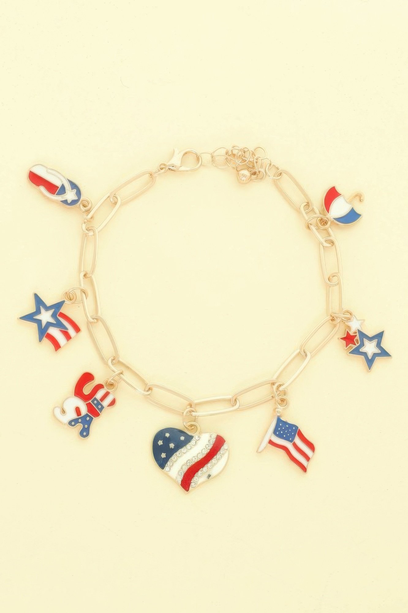 Show off your patriotic spirit with this Americana flag-themed charm bracelet, featuring enamel and rhinestone trinkets in a classic red, white, and blue palette. With its gleaming links and festive details, it’s the perfect statement piece for July Fourth celebrations, parades, or backyard BBQs. Lightweight yet striking, this bracelet brings fun, flair, and freedom to your wrist.