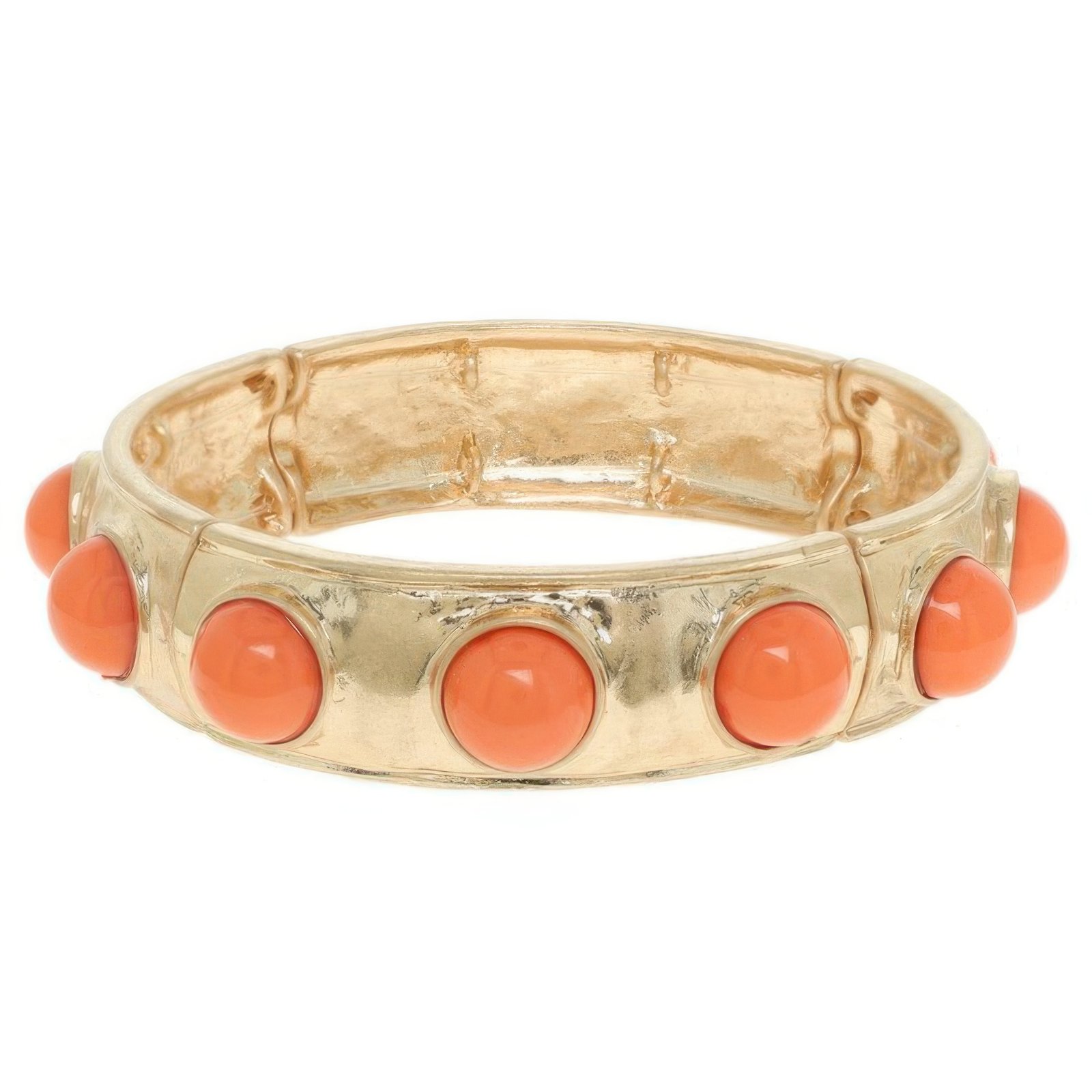 Bezel-set faux cabochon stones 8.5″ stretch fit for easy wear 0.5″ width with sleek gold-tone finish Lightweight and flexible design Great for stacking or wearing solo Perfect for everyday wear or special occasions