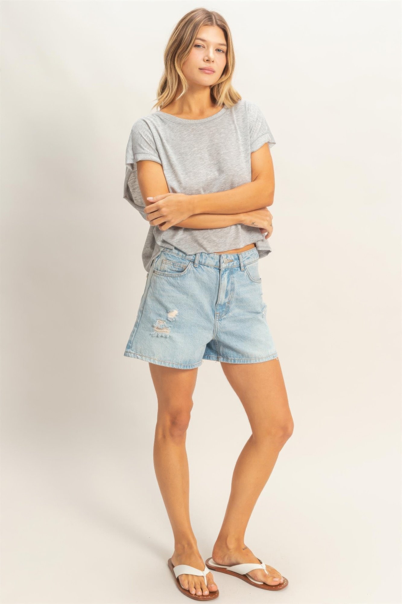 This boxy crew neck top is a versatile staple designed for effortless everyday styling. Crafted from a soft stretch-blend fabric, it offers a smooth feel with comfortable flexibility. The classic crew neckline provides timeless structure, while the relaxed sleeves enhance its easygoing appeal. A boxy silhouette creates a modern, flattering shape that pairs seamlessly with high- or mid-rise bottoms. Lightweight and breathable, it’s ideal for warm-weather wear or layering year-round. Style it with distressed denim shorts for a relaxed, casual finish.