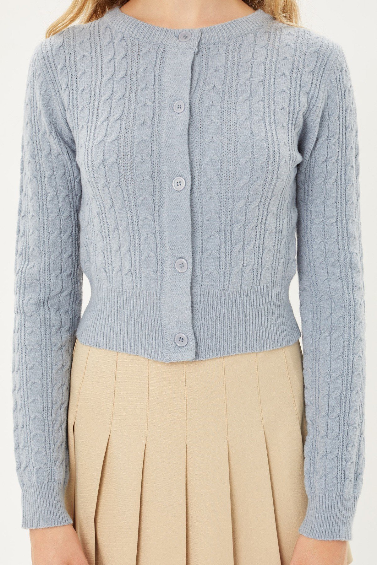 Introducing our Buttoned Cable Knit Cardigan in the serene shade of Blue Stone—a chic and cozy addition to your wardrobe.Key Features:1. Sizes: Available in S, M, and L, ensuring a comfortable fit for various body shapes.2. Fabric: Crafted with a blend of 57% Acrylic, 30% Polyester, and 13% Nylon, providing warmth and durability.3. Cable Knit Design: Embrace the classic and stylish cable knit pattern, adding a touch of sophistication.4. Buttoned Closure: Effortlessly button up this cardigan for a cozy and chic look.5. Long Sleeve Sweater: Stay warm in colder weather with the long sleeves and cable-knit texture.