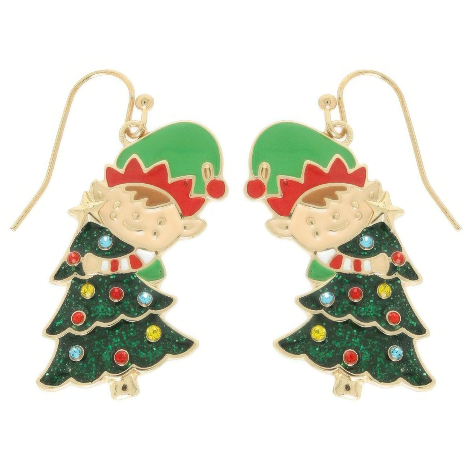 Enamel Christmas tree with elf design Rhinestone accents for festive sparkle Height: 1.5″ Width: 0.75″ Lightweight with secure French hook closure Fun and festive seasonal accessory Great for holiday parties and gift-giving