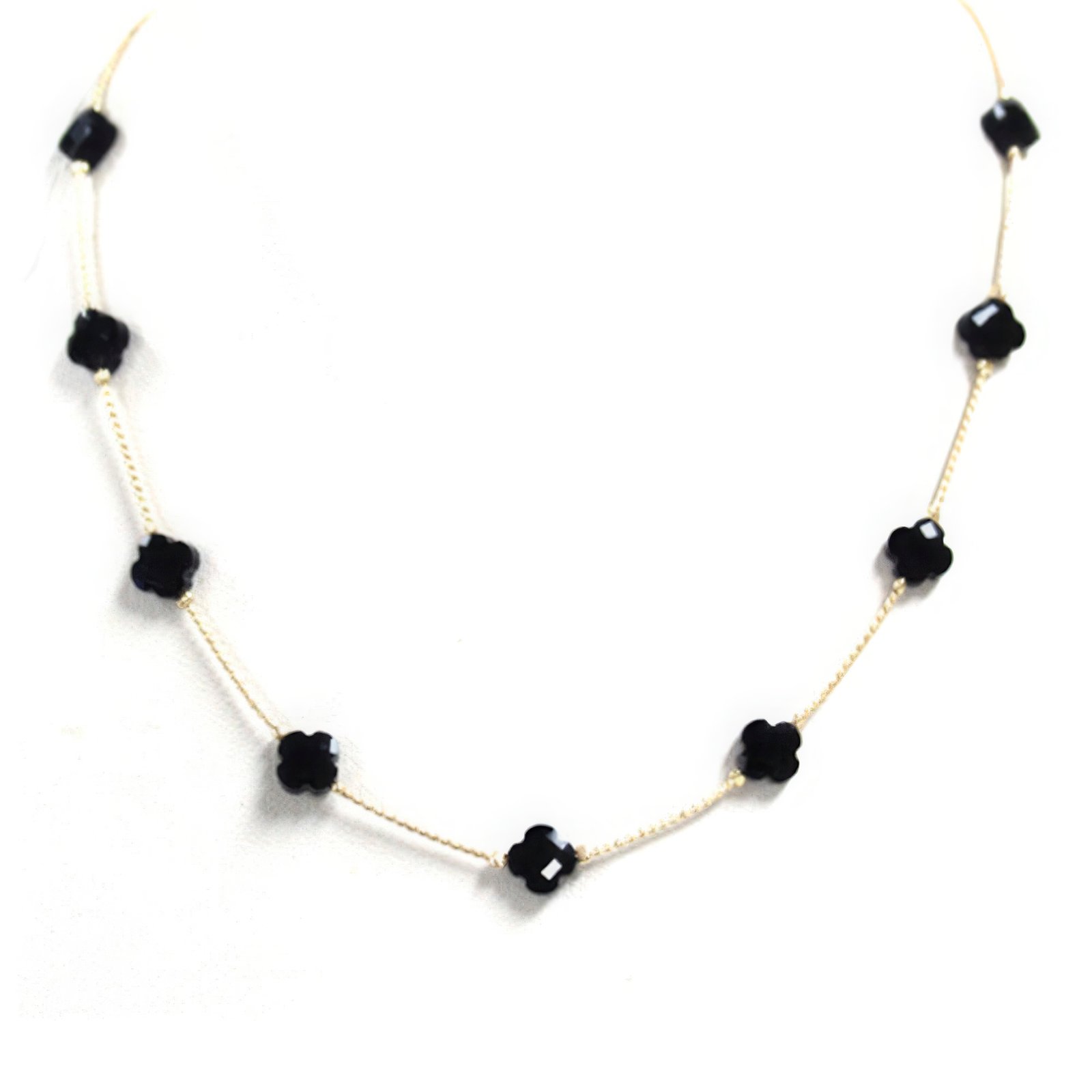 Introducing our Clover Station Necklace, a charming and versatile accessory that adds a touch of elegance to any outfit. Available in a variety of colors including blue, crystal, black, pink, and turquoise, this necklace features a delicate clover station pendant design, exuding timeless beauty and sophistication.Key Features:- Color Options: Choose from a range of beautiful colors including blue, crystal, black, pink, and turquoise, allowing you to select the perfect option to complement your personal style.- Clover Station Pendant: The necklace showcases a dainty clover station pendant, adding a whimsical and stylish accent to your ensemble.- Versatile Design: This necklace can be worn alone as a statement piece or layered with other necklaces for a trendy and personalized look.