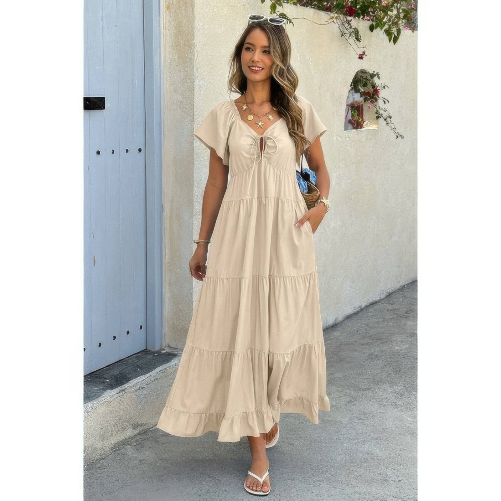 Made from 95% Polyester, 5% Elastane for comfort and stretch Cross knot front detail adds shape and visual interest Color block design for bold, contemporary style A-line silhouette flatters with a relaxed, flowy fit Side pockets for added functionality Ideal for daily wear, vacations, or casual outdoor plans