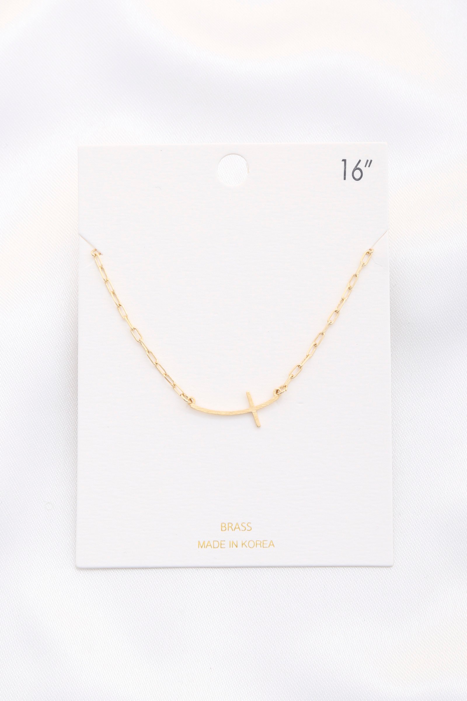 Elevate your style with our “Curved Cross Pendant Necklace,” a symbol of faith and fashion that seamlessly blends timeless elegance with contemporary design. Meticulously crafted with precision, this necklace is a statement piece that adds a touch of grace to any ensemble.Key Features:1. Material: Choose from the luxurious Gold or the sleek Rhodium finish, each providing a unique and sophisticated look.2. Pendant Design: The curved cross pendant offers a modern twist on a classic symbol, making a bold and stylish statement.3. Chain: The delicate yet sturdy chain complements the pendant, ensuring a balanced and harmonious design.