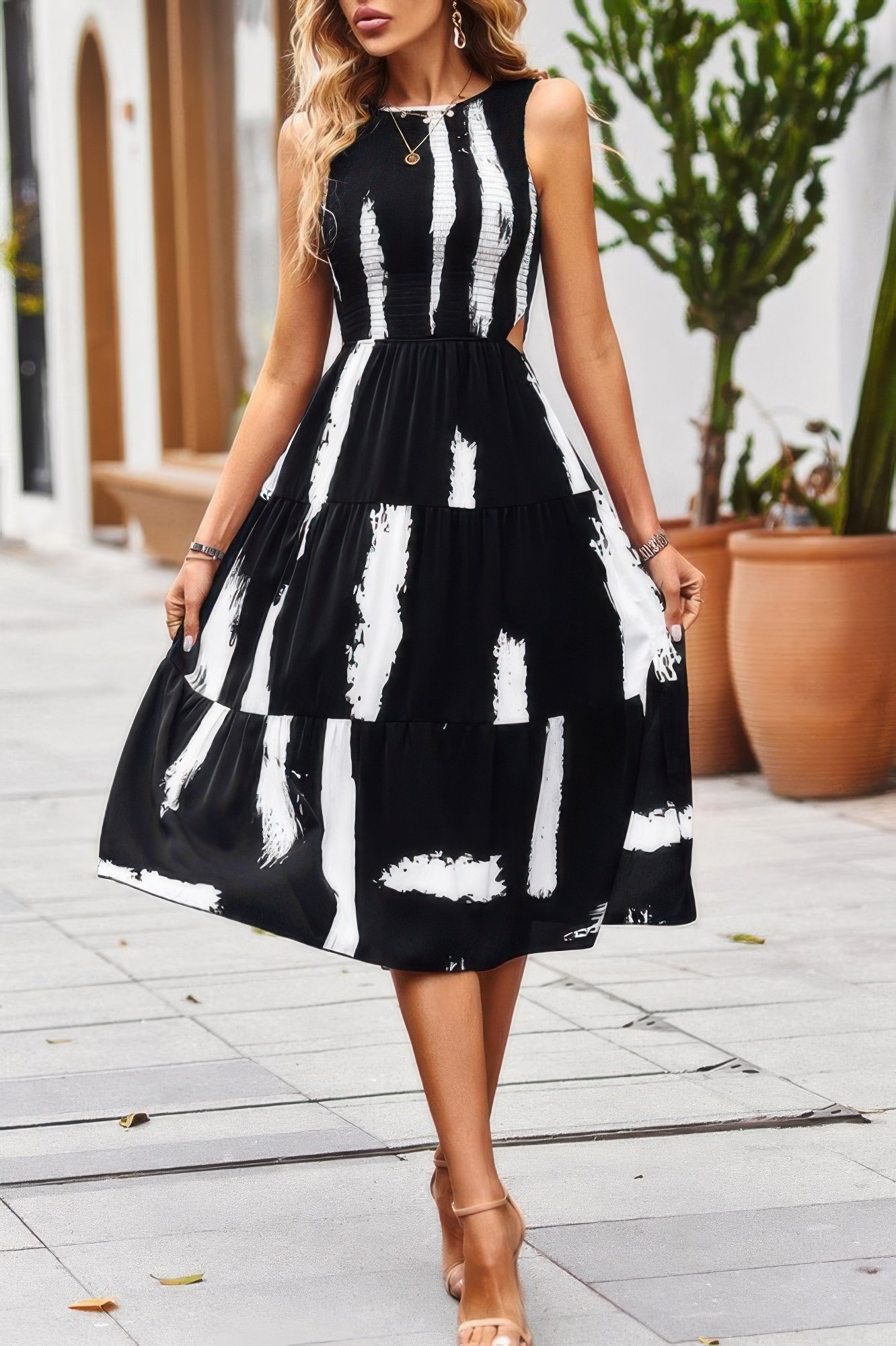 Feminine and flirty, this sleeveless dress features a flattering ruched fit, playful cut-out detail, and delicate ruffle accents. Designed in a soft, comfy fabric, it drapes effortlessly while enhancing your silhouette. The floral print adds a vibrant, romantic touch, making it perfect for sunny days or festive getaways. Whether you’re heading to a vacation brunch or a casual evening out, this dress delivers charm with every step.