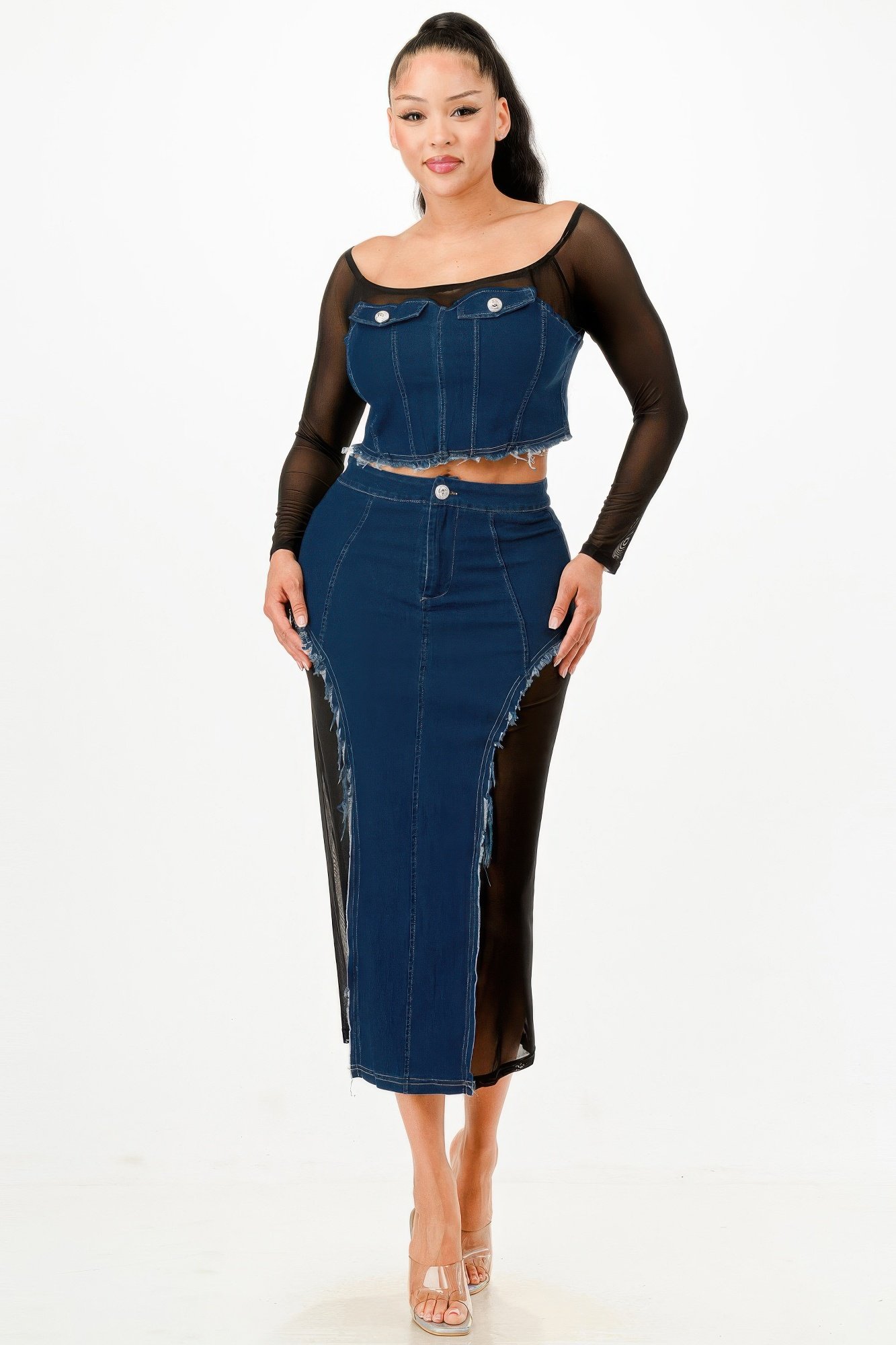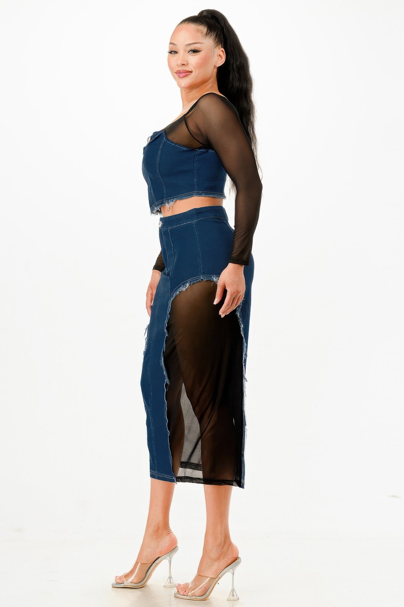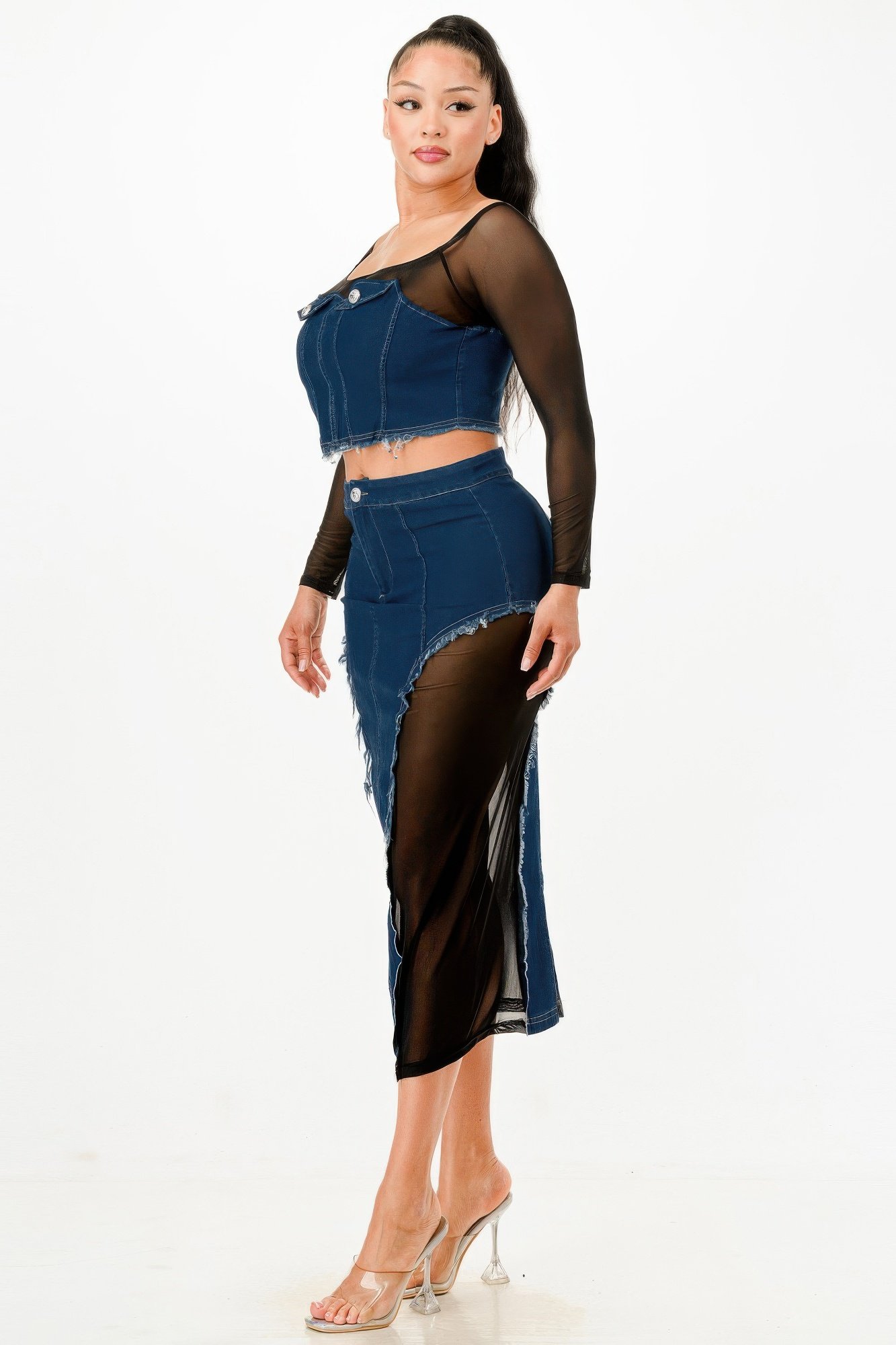 Bold and fashion-forward, this denim dress two-piece set redefines modern street style. Featuring a patchwork mesh see-through cropped top paired with a sleek denim dress, it strikes the perfect balance between edgy and chic. The zipper-back detail adds a touch of sophistication, while the stretch fabric ensures a flattering, comfortable fit. Ideal for nights out or stylish daytime events, this set is designed to make a confident statement.