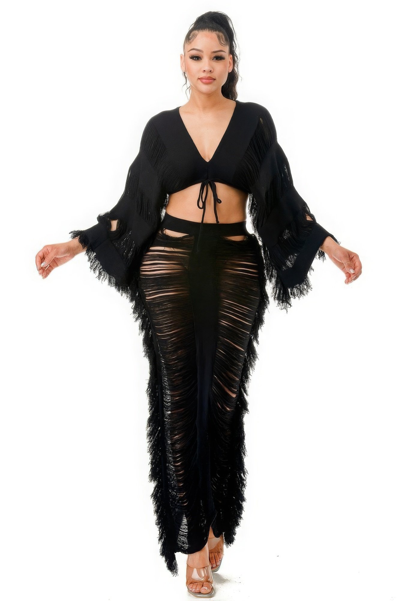 Elevate your style with our Distressed Long Skirt Set, a captivating ensemble that effortlessly blends fashion-forward design with comfort. Carefully curated and crafted, this set is designed to make a statement while ensuring a comfortable and stylish experience.Key Features:1. Fabric: Immerse yourself in the allure of our Distressed Long Skirt Set, made from a delicate blend of 55% viscose, 27% polyester, and 18% nylon, offering a perfect combination of softness and durability.2. Sizes: Available in a range of sizes, including S, M, and L, ensuring a tailored fit for every body type.3. Sunsuit Cover Up: Embrace the versatility of this set with a sunsuit cover-up featuring a cropped lace-up design, both stylish and functional.4. V-Neck: Flaunt a captivating front and back V-neck design that adds a touch of sophistication to your ensemble.5. Skirt Elastic Waistband: Enjoy comfort and flexibility with the elastic waistband on the full-length skirt.6. See-Through Material: Elevate your look with the alluring see-through material that adds an element of intrigue to your outfit.