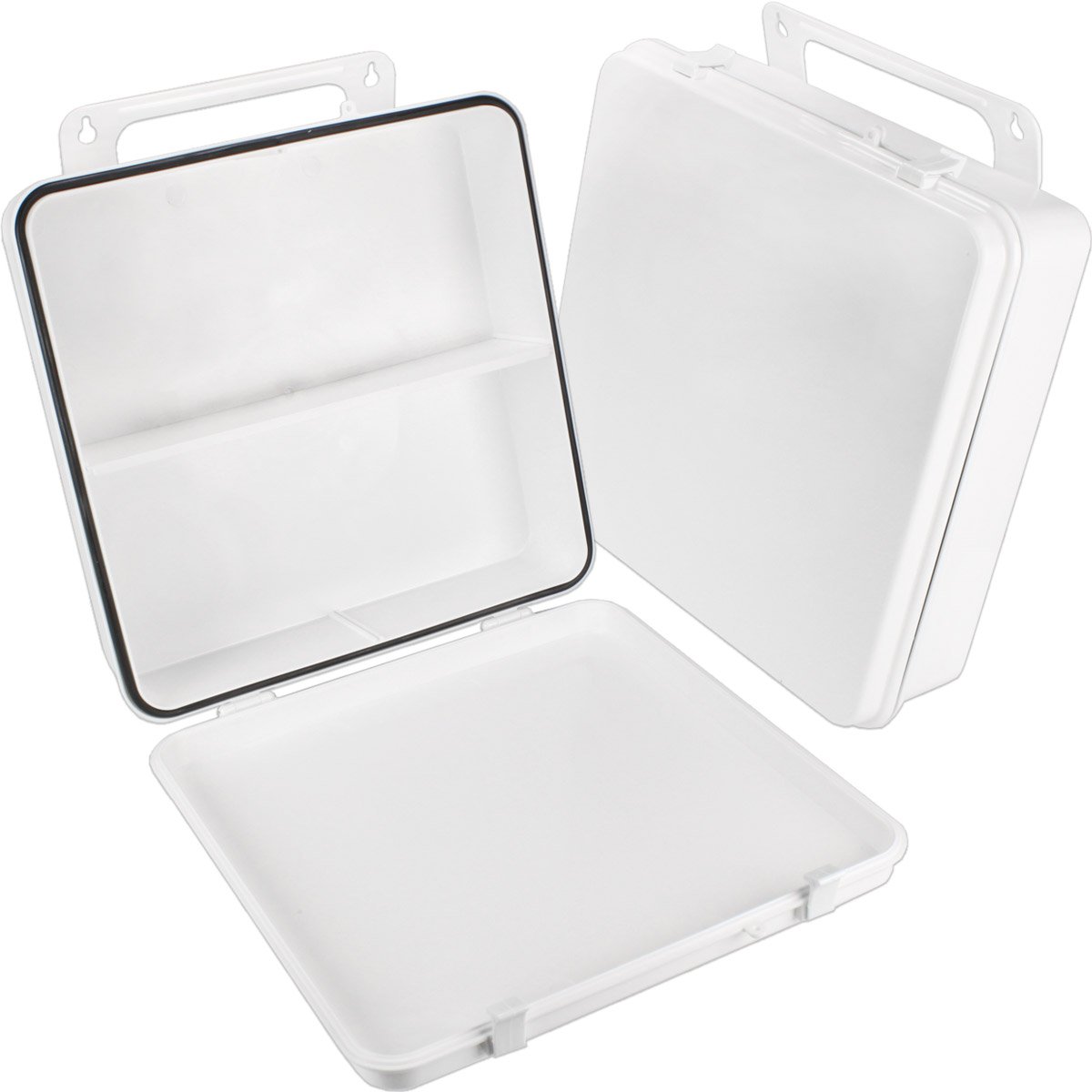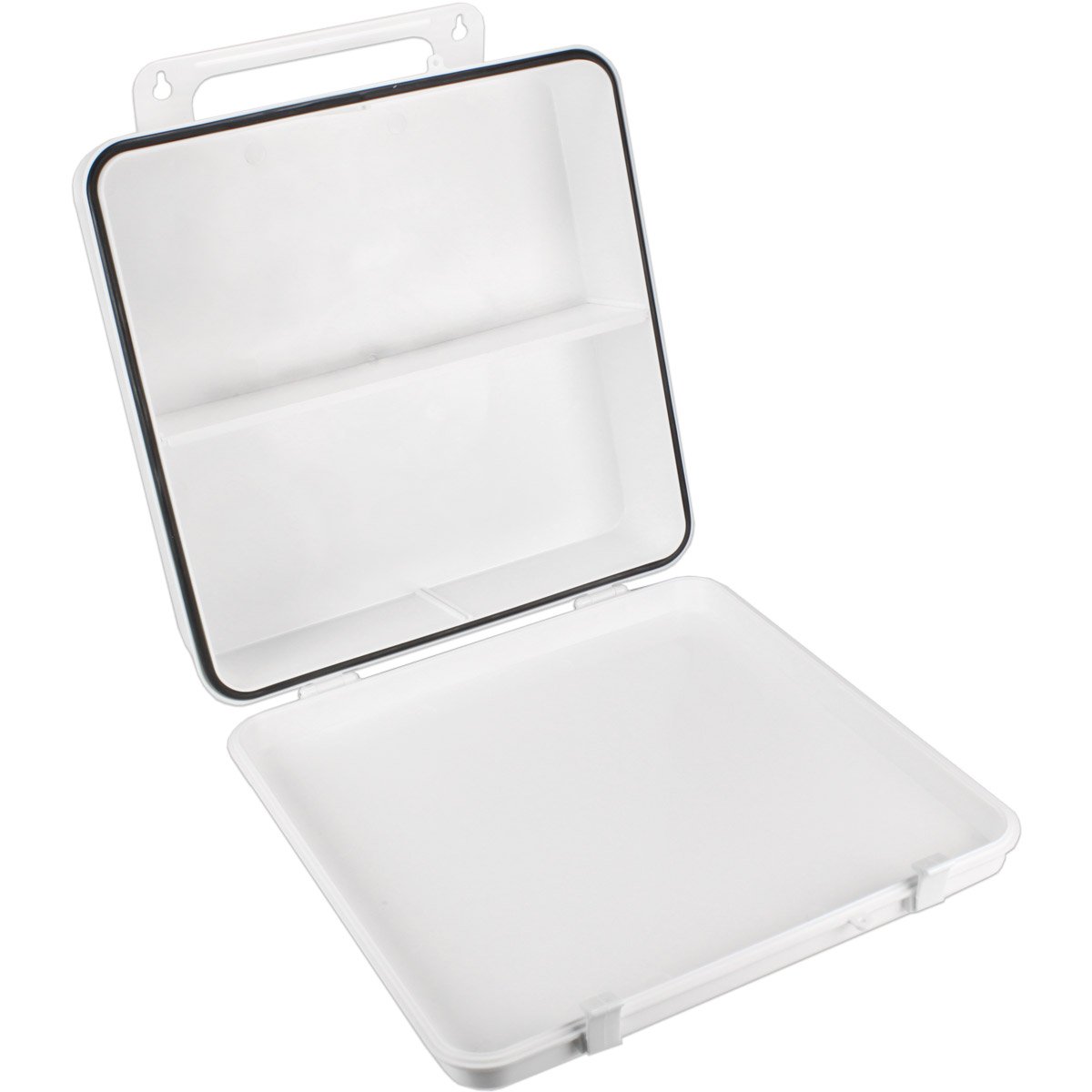 24 Unit, Empty Polypropylene Case w/ Gasket & Handle Hanger, 9-3/16″x9-3/16″x2-3/4″ – 1 Each This empty plastic first aid case holds up to 24-units of product and features a gasket and polypropylene handle hanger. Case Dimensions: 9-3/16″x9-3/16″x2-3/4″