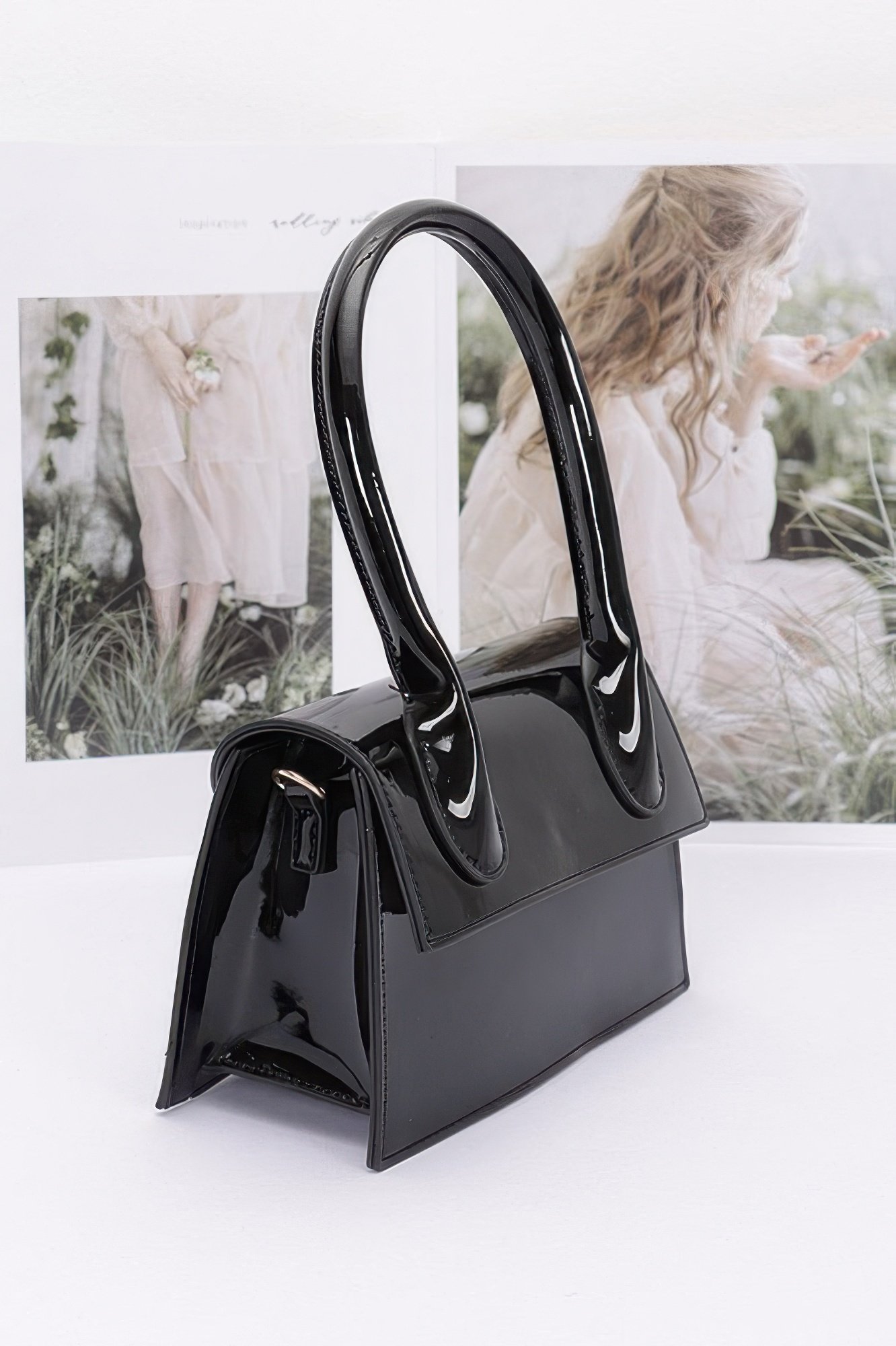 Approx. 7″W x 5″H x 3″D Polyurethane with smooth enamel-style finish Top handle and detachable crossbody strap Structured silhouette with compact space Magnetic or clasp closure Perfect for polished daywear or events