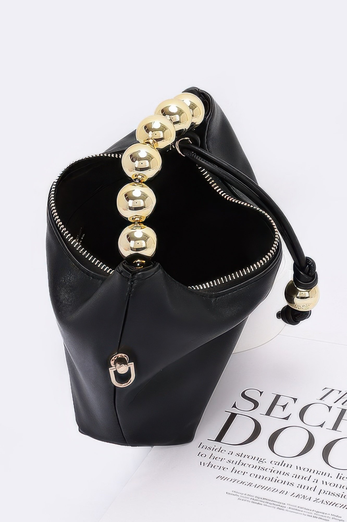 Modern meets elegant in the Faux Leather CCB Ball Handle Bag. Crafted from smooth faux leather and adorned with a distinctive CCB ball handle, this bag makes a bold impression. Its compact shape and gold-tone hardware offer luxury in every detail, making it a perfect accessory for special occasions or elevated daywear.