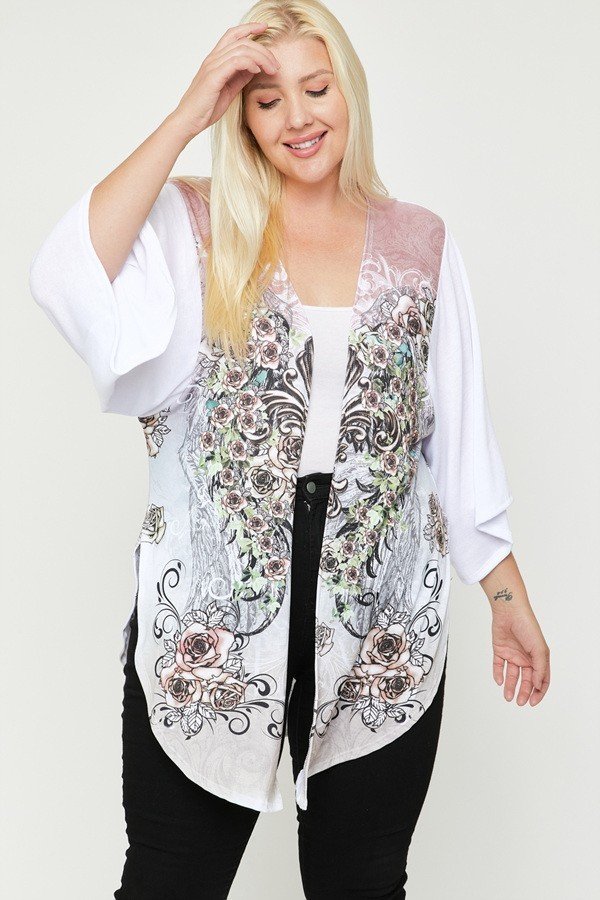 Introducing our Floral Wings Sublimation Print Long Body Cardigan—a statement piece that seamlessly merges style and comfort. Revel in the enchanting floral wings sublimation print that graces this garment, creating a captivating visual allure.Key Features:1. Fabric: Indulge in the luxurious blend of 33% Rayon, 63% Polyester, and 4% Spandex for a garment that feels as good as it looks.2. Fit: Embrace the versatile fit of this long body cardigan with side slits, offering a flattering silhouette for sizes 1XL, 2XL, and 3XL.3. Color Options: Radiate elegance in the White/Multi color scheme, adding a vibrant touch to your wardrobe.4. Design: Elevate your style with kimono-style sleeves, enhancing the overall grace of this unique piece.5. Versatile Styling: Enjoy the flexibility of wearing it with side slits for a contemporary look or tying it for a more fitted appearance.