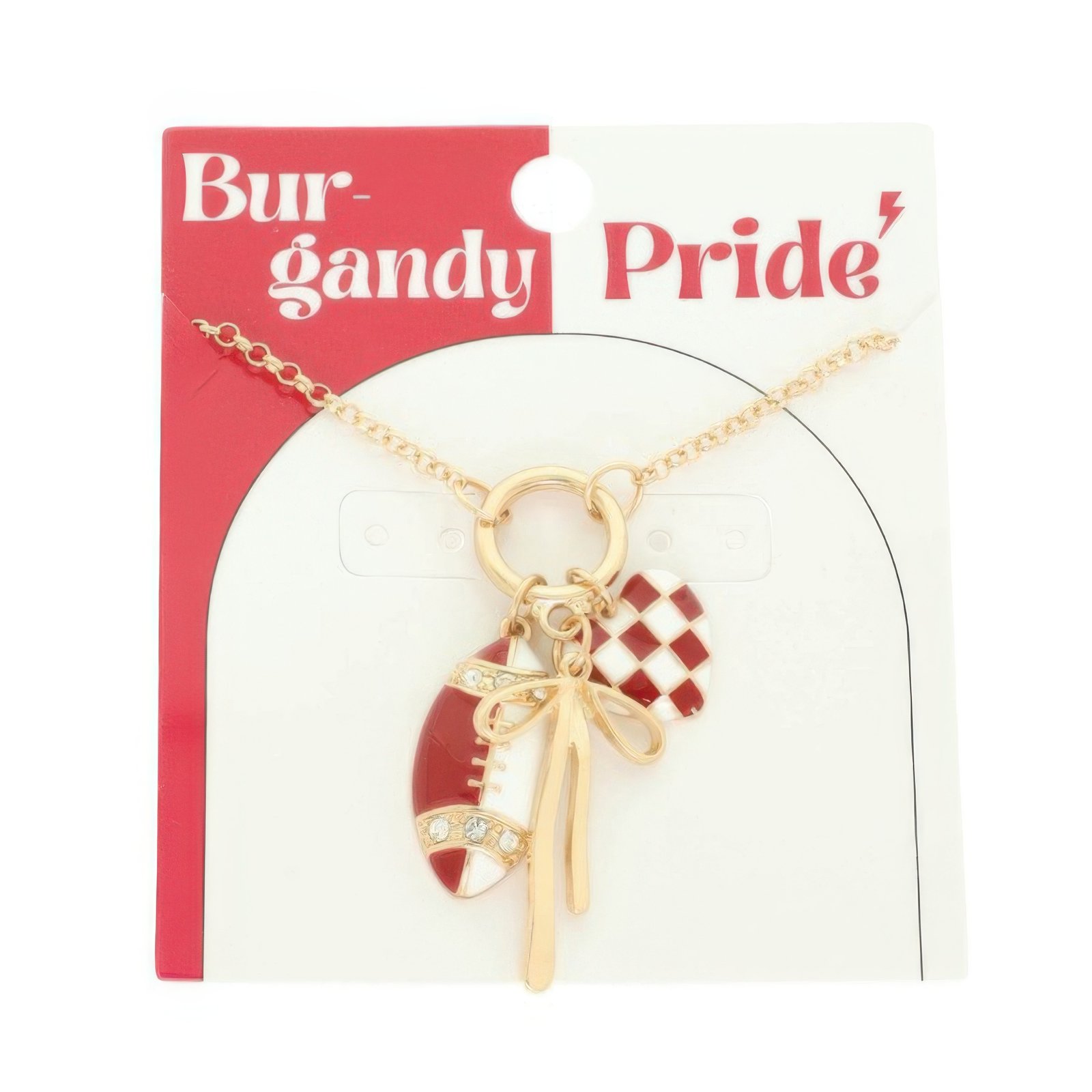 Material: Metal/enamel Features: Football, megaphone, heart, and bow trinkets 18″ chain with 3″ extension Lightweight and adjustable Fun accessory for school events or sports outings