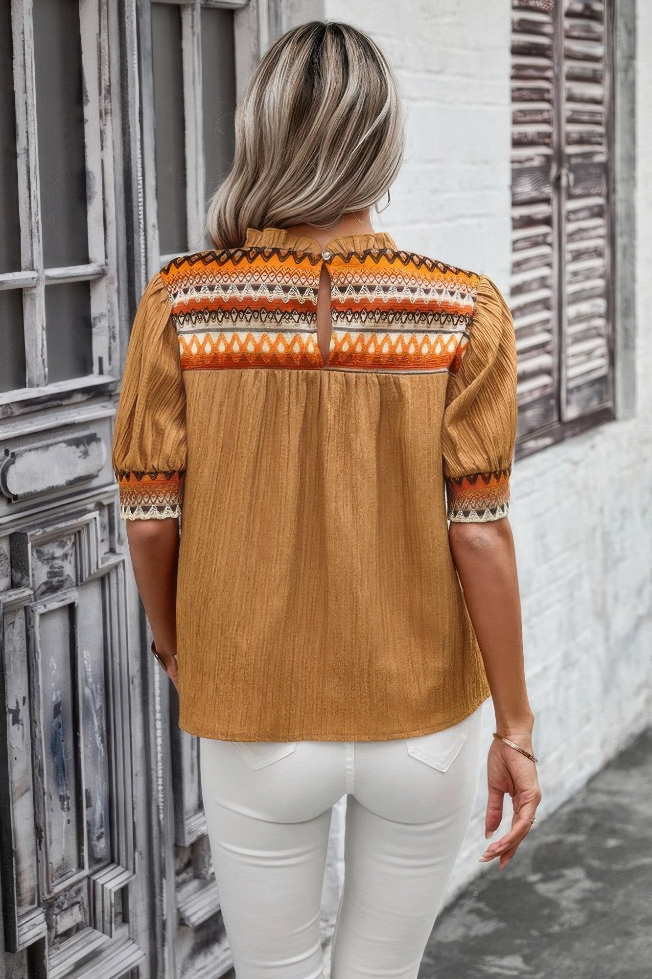 This geometric print elegant textured puff sleeve shirt is a refined yet playful addition to your casual wardrobe. Made from a blend of 95% polyester and 5% elastane, it offers a soft, stretchy feel that ensures all-day comfort. The geometric print brings a modern edge, while the puff short sleeves add a subtle touch of femininity and sophistication. Its lightly textured finish gives it a unique, elevated look, making this shirt perfect for casual outings, vacation getaways, or daily wear. Pair it with your favorite jeans or trousers for a chic, polished ensemble.