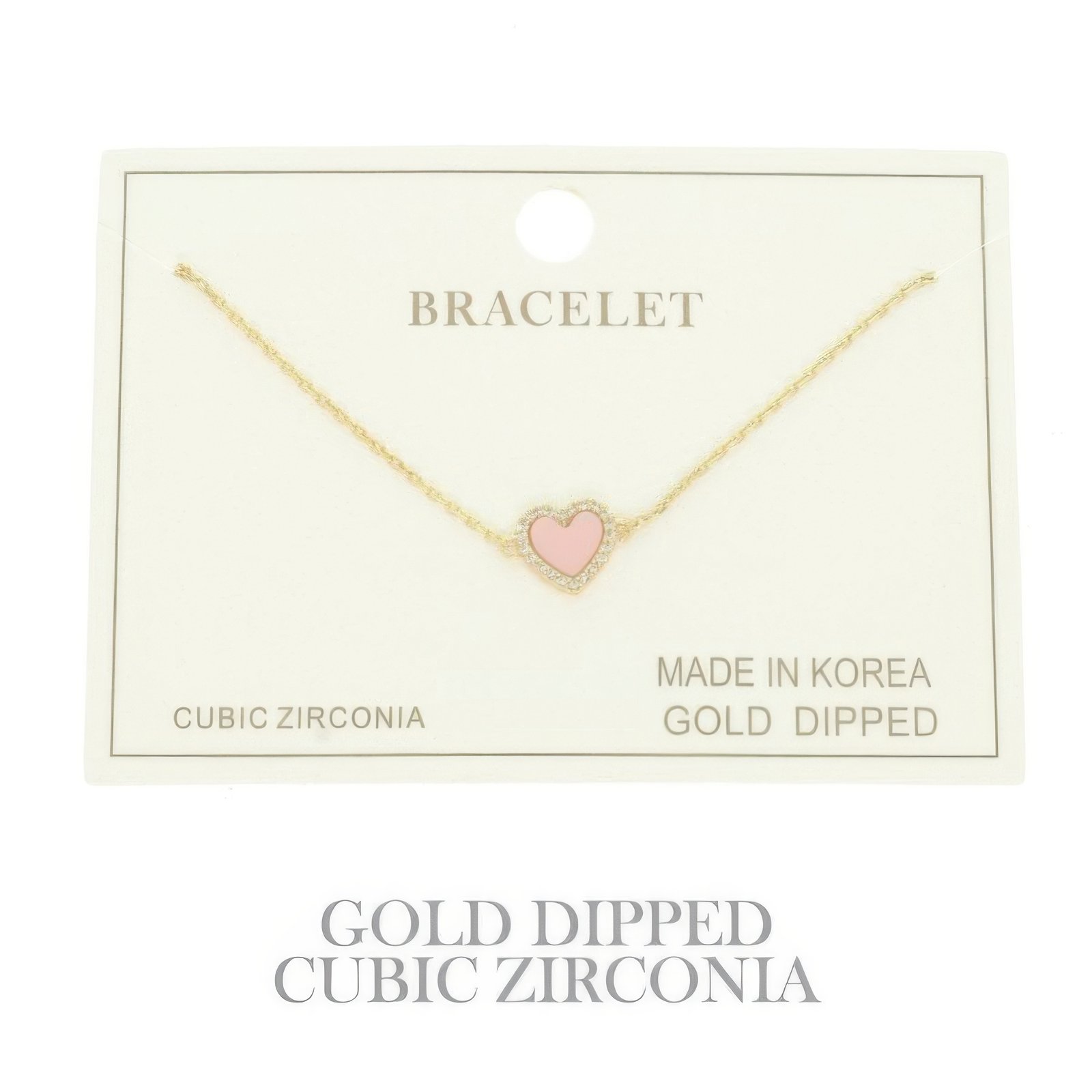 Enamel inlay heart charm with cubic zirconia pavé Available in yellow or white gold plating Bracelet length: 7″ with 0.5″ extension Width measures 0.3″; adjustable secure clasp Lightweight and ideal for stacking or solo wear Great for gifting or special occasions