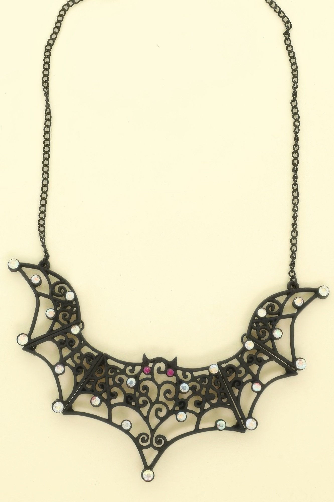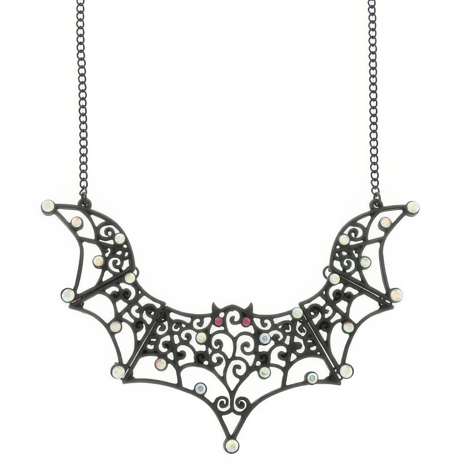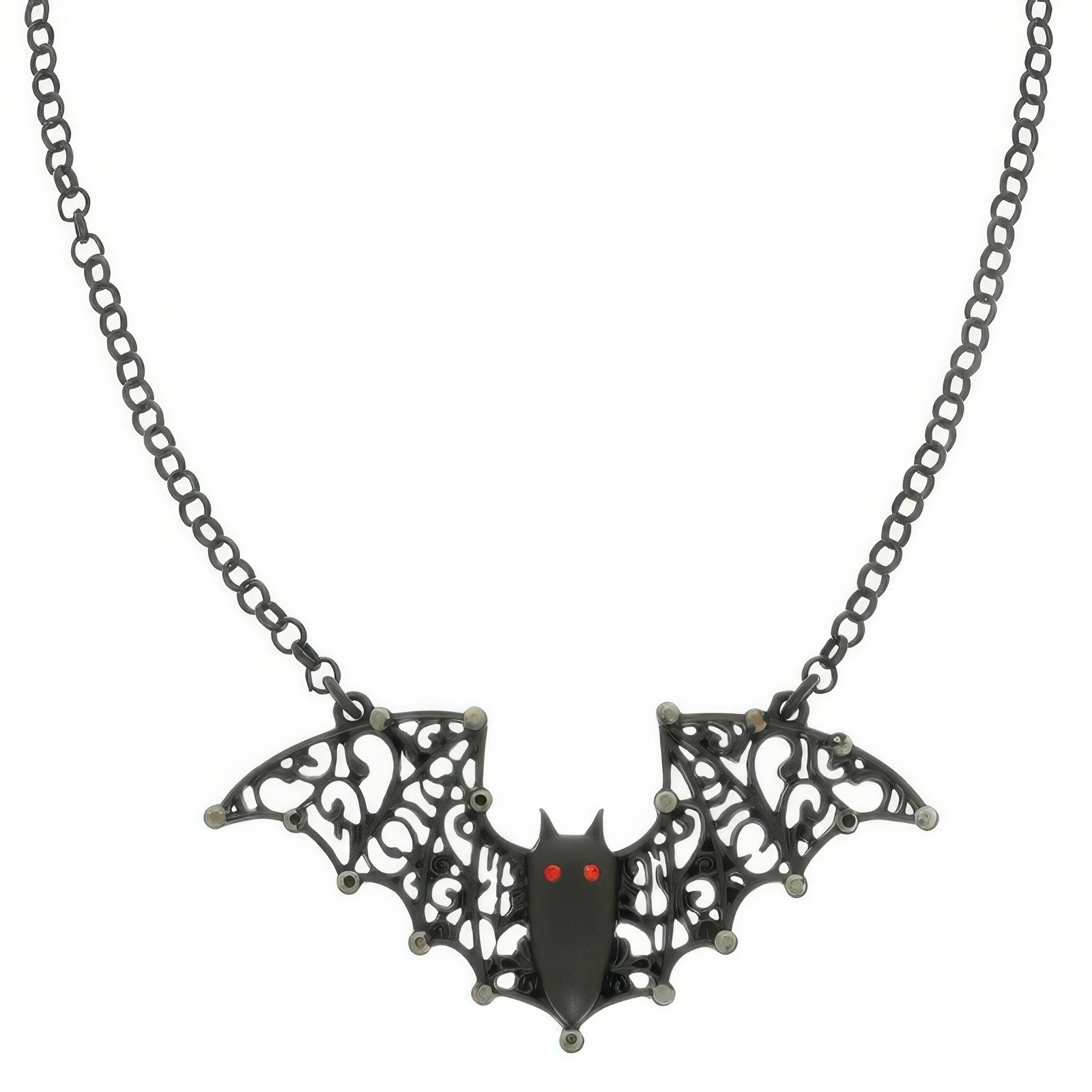 Matte black bat pendant with cutout wing design Chain length: 16″ with 3″ extender; Pendant drop: 1.25″ Lightweight and comfortable for extended wear Subtle red eye detail for extra flair Great for Halloween, cosplay, or alt fashion looks Easy to layer with chokers or wear solo for impact