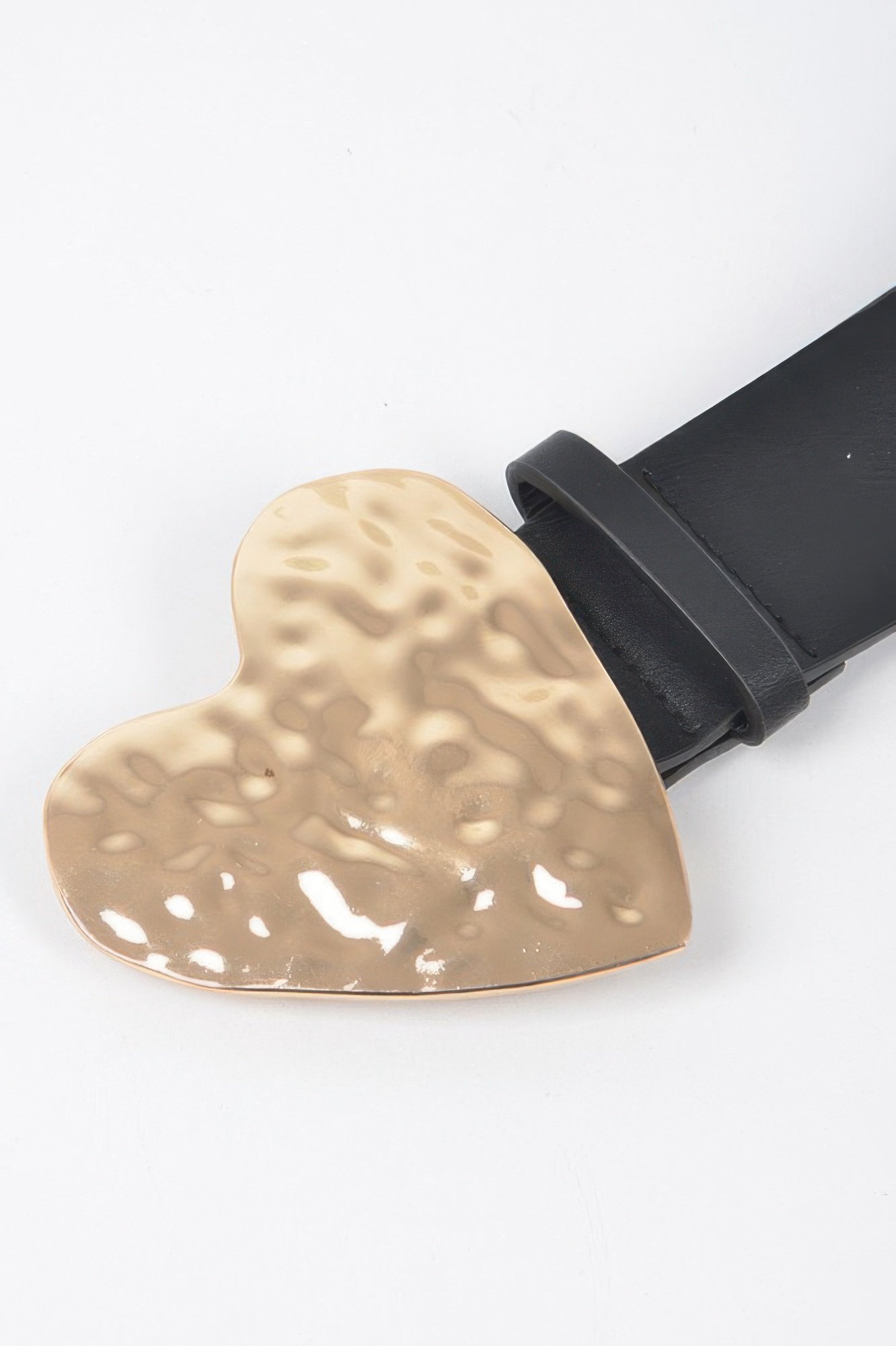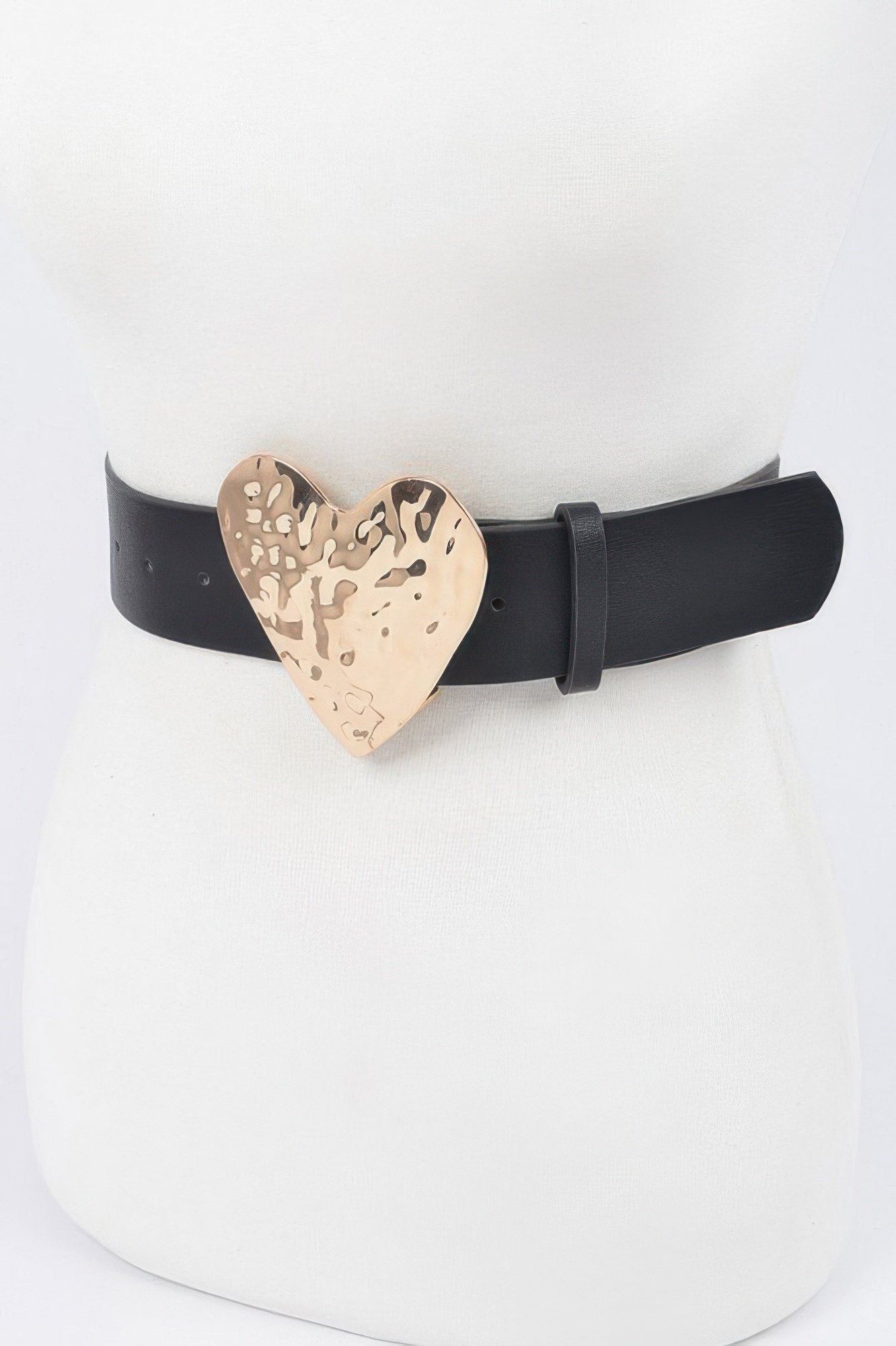 Materials: Polyurethane and iron Approximate dimensions: 1.75″ wide, 51″ long Hammered gold-tone heart-shaped buckle Faux leather strap with smooth finish Designed to comfortably fit plus-size waists Ideal for casual, romantic, or special occasion wear