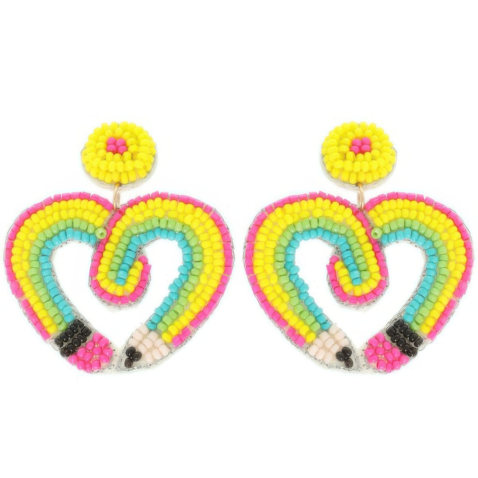 Heart-shaped post dangle earrings with pencil bead pattern Crafted with colorful seed beads for a vibrant look Approximate dimensions: 2″ height x 1.75″ width Lightweight and comfortable for everyday wear Great for teacher gifts, school events, or casual outings Whimsical and fun accessory with education-inspired charm