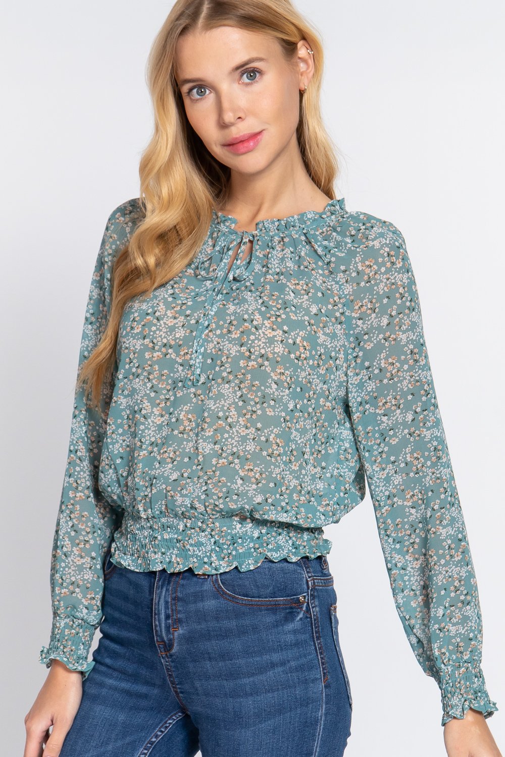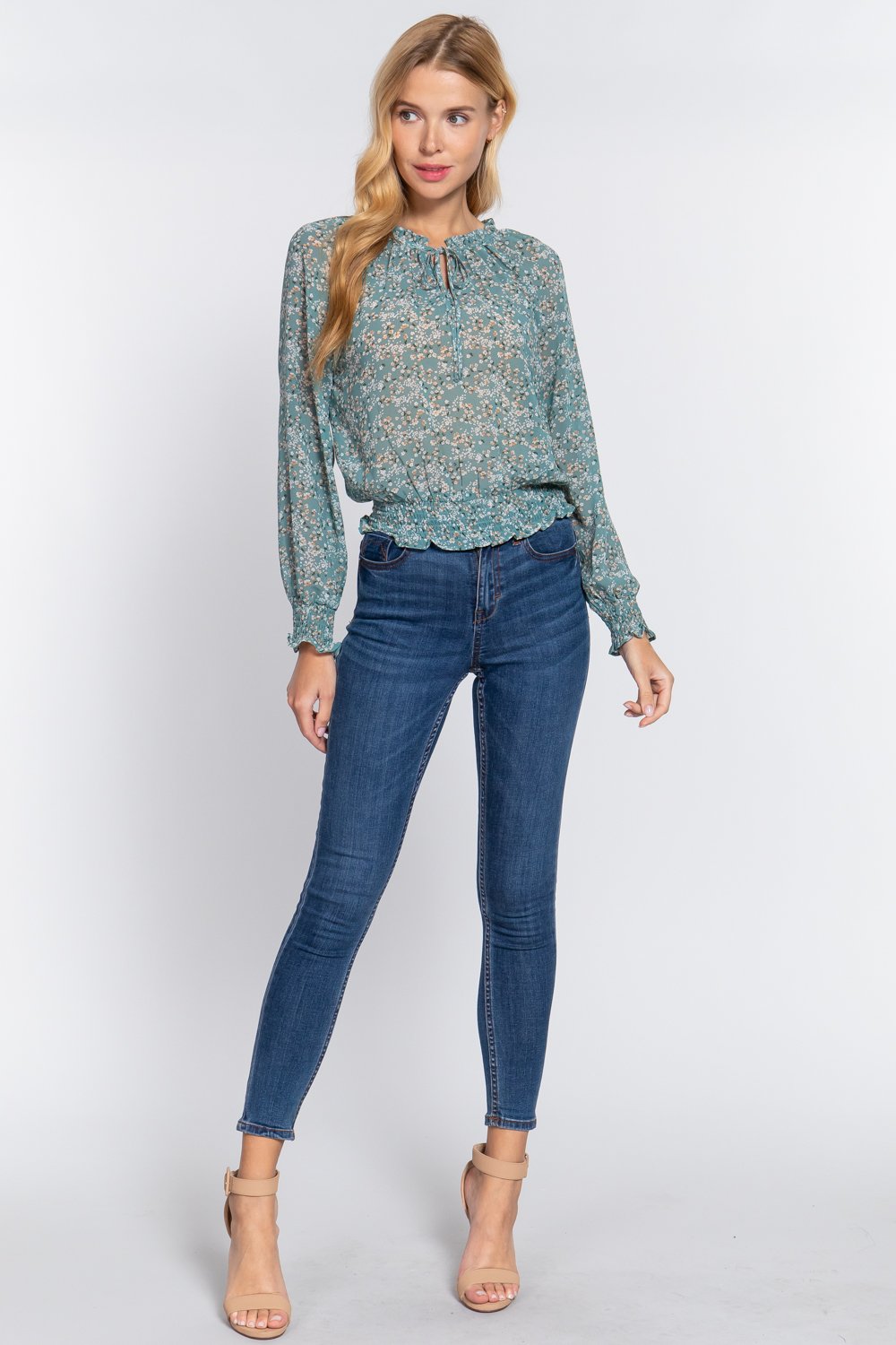 Elevate your wardrobe with our Long Sleeve Front Tie Detail Smocked Hem Floral Printed Woven Top in Leaf Green, a charming and stylish piece designed to add a touch of femininity to your ensemble. Available in S, M, and L sizes, this woven top effortlessly combines comfort and fashion.Key Features:1. Fabric: Crafted from 100% Polyester, our top offers a lightweight and breathable feel for all-day comfort.2. Design: Embrace the floral elegance with long sleeves, a front tie detail, and a smocked hem that adds a playful and flattering touch to the silhouette.3. Color: In a vibrant Leaf Green hue, this top brings a fresh and lively element to your wardrobe, suitable for various occasions.Versatile Styling: Whether paired with jeans, skirts, or shorts, the Long Sleeve Front Tie Detail Smocked Hem Floral Printed Woven Top in Leaf Green effortlessly enhances your casual chic ensemble.