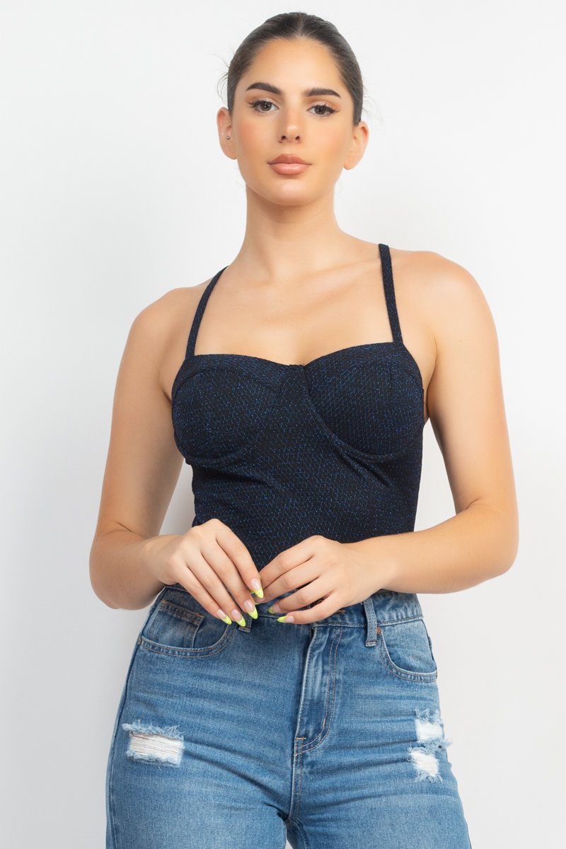 Introducing our Lurex Sweetheart Cami Bodysuit, a chic and captivating piece that seamlessly combines metallic design with a flattering silhouette.Key Features:1. Design: Embrace the allure of a metallic lurex bodysuit featuring a sophisticated sweetheart neckline.2. Supportive Features: Padded bra cups and underwire provide optimal support and enhance your natural shape.3. Adjustable Straps: The cami bodysuit is equipped with adjustable straps for a personalized and comfortable fit.