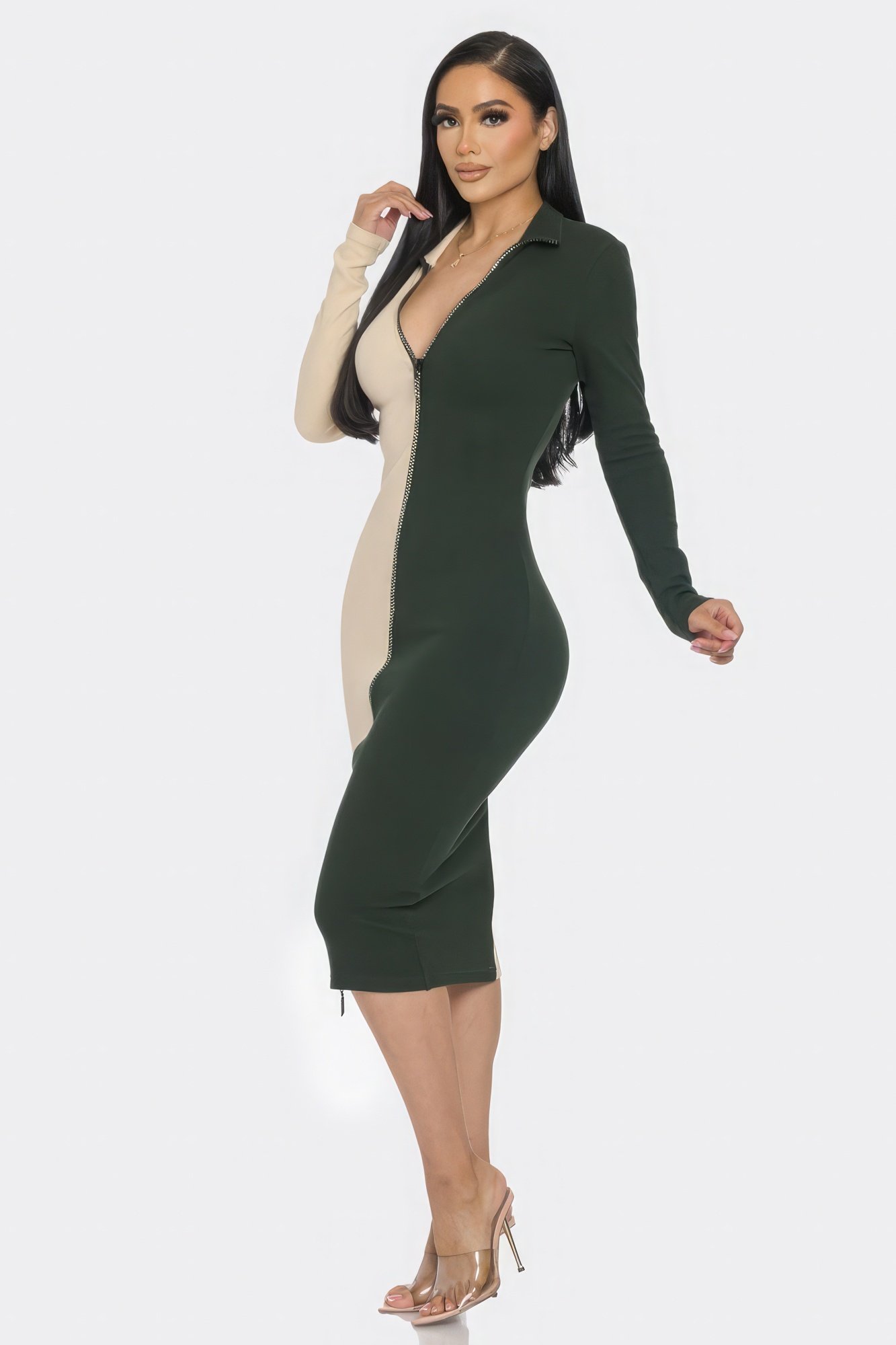 Enhance your wardrobe with our Midi Long Sleeve Mock Neck Color Block Dress—a stylish and comfortable piece designed with meticulous attention to detail. This dress is a contemporary addition to your collection, offering a perfect blend of modern fashion and ease.Key Features:1. Fabric: Experience a luxurious feel with our high-quality blend of 95% Polyester and 5% Spandex.2. Fit: Embrace a flattering fit with size options ranging from Small (S) to Large (L).3. Color Options: Embrace the vibrancy of our Green color palette.4. Design: Stand out with a chic color block pattern and elevate your style with rhinestone zipper details.