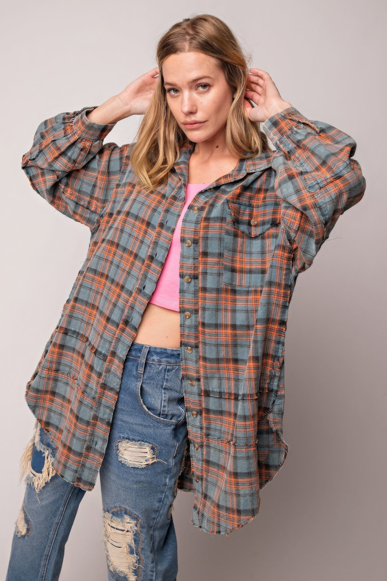 Introducing our Mineral Washed Plaid Shirt—a timeless and effortlessly stylish piece that combines the classic appeal of plaid with a contemporary touch. This shirt features a button-down front, a rounded bottom hem, and a loose fit with a boxy silhouette, creating a laid-back yet chic look. With a chest patch pocket, buttoned cuffs, and frayed detailing, this shirt adds a unique edge to your wardrobe.Key Features:1. Fabric: Immerse yourself in the comfort of 100% Cotton, providing a soft and breathable feel against your skin.2. Fit: Embrace the loose fit and boxy silhouette of this plaid shirt, allowing for easy movement and a modern, casual look.3. Color Options: Choose the Vintage Teal hue for a vintage-inspired and stylish addition to your wardrobe.4. Sizes: Select from the sizes S, M, and L to find your perfect fit.5. Design: Featuring a button-down front, rounded bottom hem, chest patch pocket, and frayed detailing for a unique and contemporary aesthetic.6. Versatile Styling: Pair it effortlessly with jeans or leggings for a laid-back yet polished ensemble.