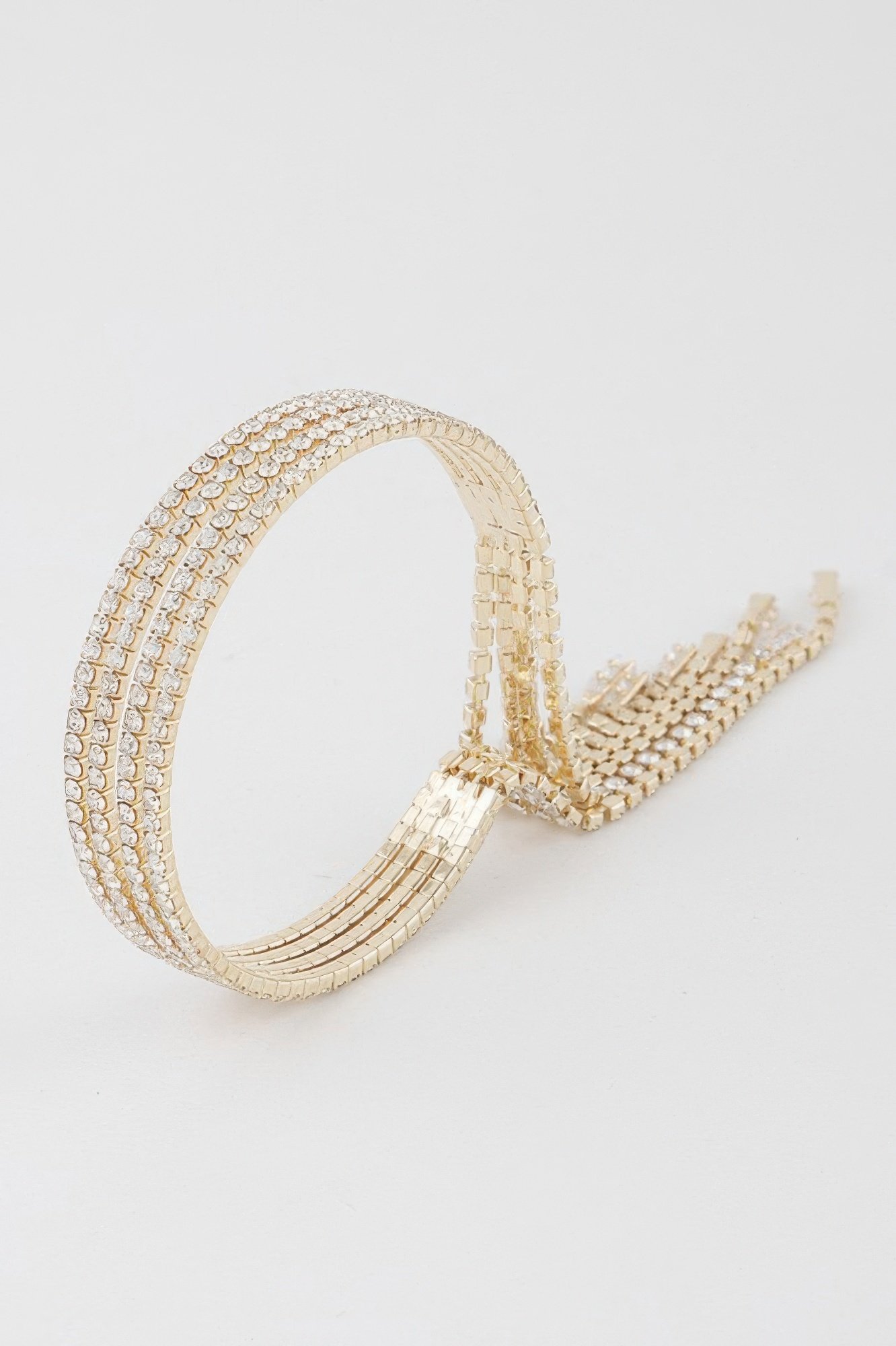 Cuff bracelet with multiple rhinestone drop accents Approximate size: 2.2 x 2.2 inches Structured cuff silhouette for easy wear Sparkling rhinestones create elegant movement Lightweight design with bold visual impact Ideal accessory for evening or event styling