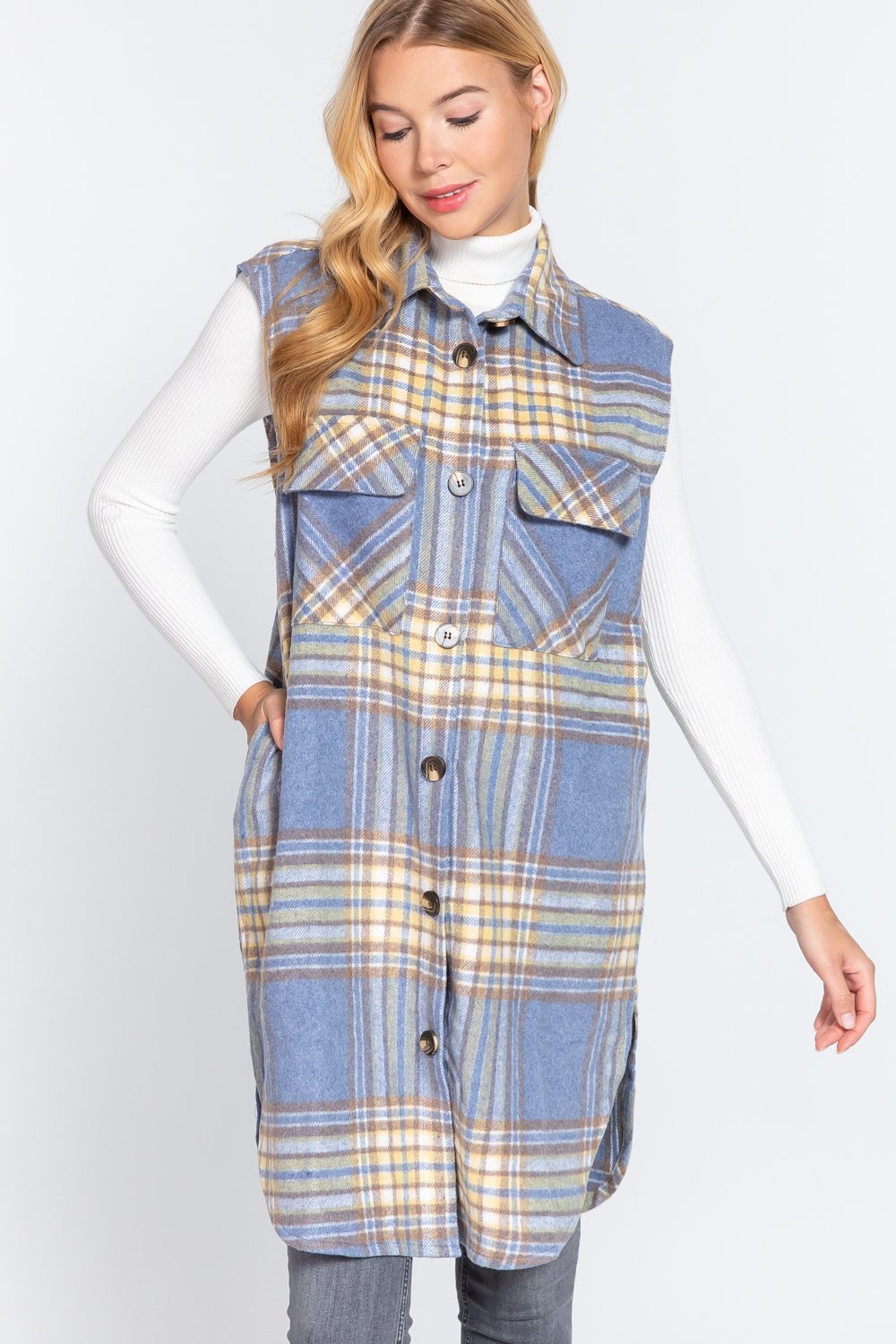 Introducing our Notched Collar Brushed Plaid Vest—an essential layering piece that seamlessly combines comfort and style. This sleeveless vest features a distinctive notched collar, front pockets, and a classic button-down design, creating a timeless look. Crafted from a blend of 95% Polyester and 5% Wool, the Blue/Mustard plaid pattern adds a touch of sophistication to this versatile wardrobe staple.Key Features:1. Fabric: Experience the luxurious blend of 95% Polyester and 5% Wool, ensuring both warmth and durability.2. Design: Embrace the sleeveless silhouette with a notched collar, front pockets, and a classic button-down front for a polished and timeless aesthetic.3. Color: Choose the Blue/Mustard plaid pattern for a versatile and stylish addition to your wardrobe.