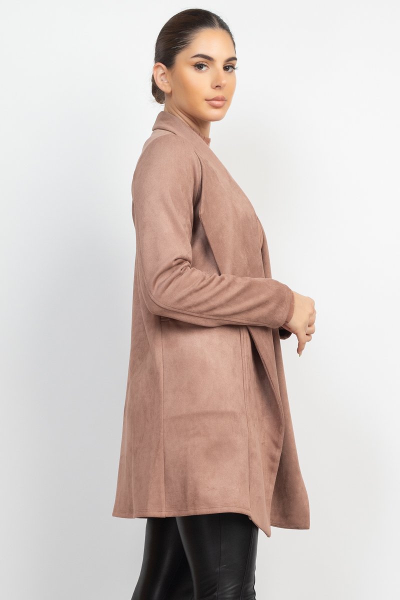 Introducing our Open Front Suede Blazer in Dark Mauve, a sophisticated and versatile piece that effortlessly elevates your wardrobe with its timeless design.Key Features:1. Design: Embrace the classic elegance of a faux suede blazer featuring a notch collar, long sleeves, and an open front for a polished and modern look.2. Pockets: Side pockets add a functional and stylish element to the blazer, making it both fashionable and practical.3. Fabric Composition: Crafted from a blend of 95% Polyester and 5% Spandex, ensuring a soft, comfortable, and stretchy fit.4. Color Option: Choose the rich and elegant Dark Mauve for a versatile and timeless ensemble.