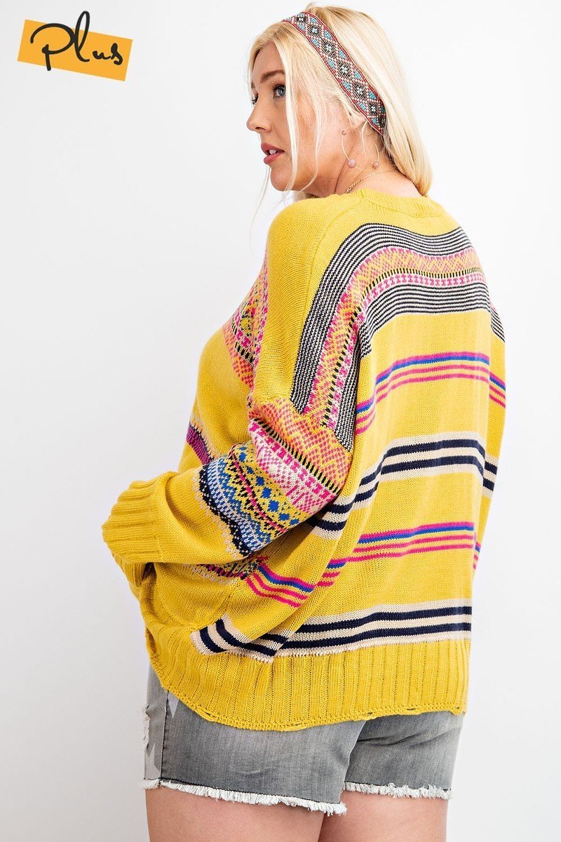 Introducing our Plus Size Boho Patterned Knitted Sweater Pullover, a stylish and cozy addition to your wardrobe, specially designed for comfort and fashion-forward style.Key Features:1. Sizes: Available in 1XL, 2XL, and 3XL to ensure a perfect fit for every body shape.2. Pattern: Adorned with boho-inspired stripes, this knitted sweater boasts a unique and eye-catching design.3. Fit: Featuring a loose fit for comfort and a laid-back, relaxed vibe.4. Material: Crafted from 100% Acrylic for a soft and warm feel against the skin.5. Color: In a vibrant Mustard shade, adding a pop of color to your ensemble.
