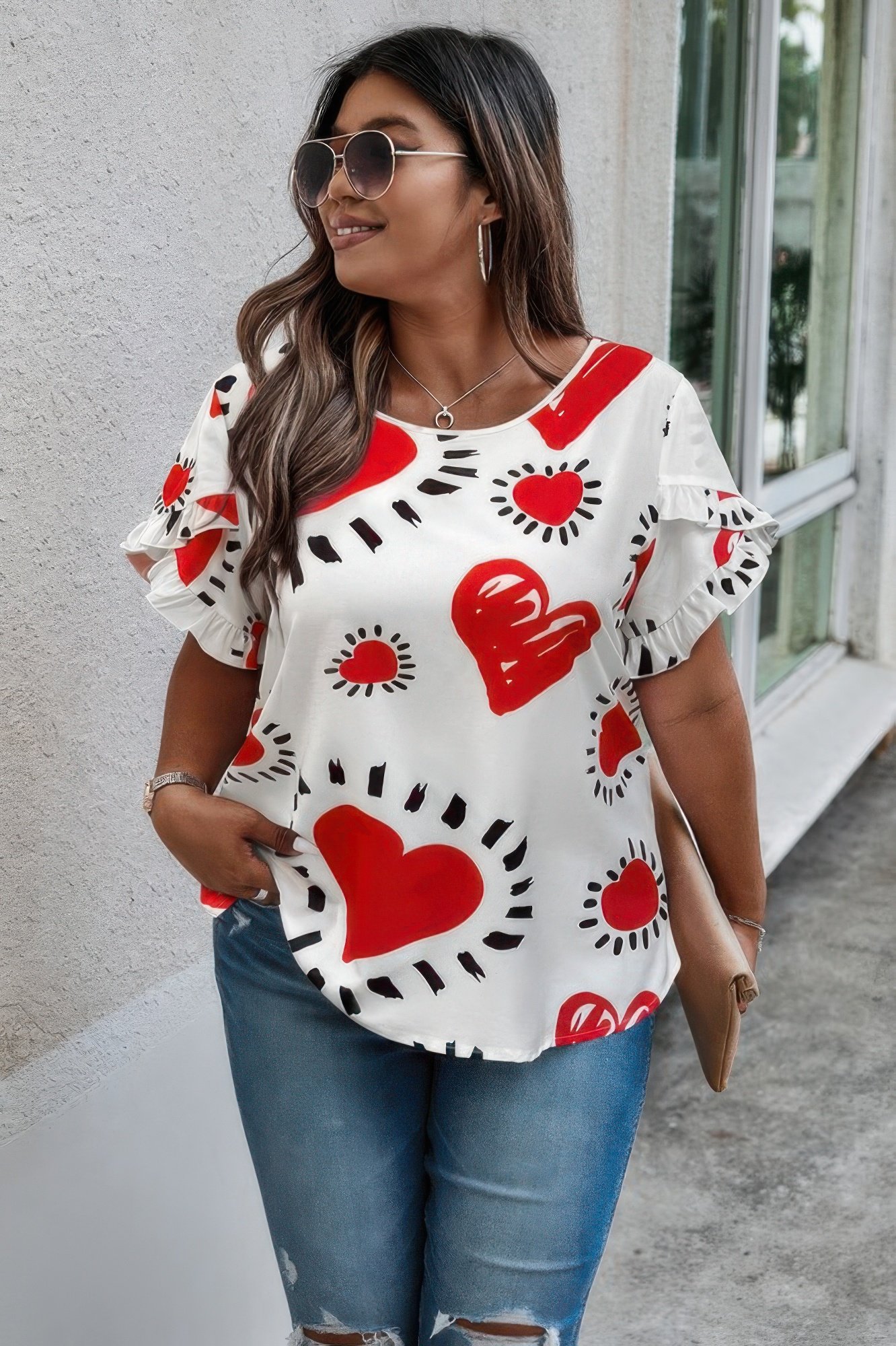 Add a playful touch to your everyday wardrobe with this charming plus size heart print shirt. Designed with flattering ruffle hem sleeves, this top effortlessly combines comfort and style. The soft, stretchy fabric ensures a comfortable fit for all-day wear, while the eye-catching heart pattern brings a fun, feminine vibe to any outfit. Perfect for casual days, weekend getaways, or laid-back outings, this versatile piece pairs beautifully with jeans, shorts, or skirts. With its relaxed fit and thoughtful design details, it’s an easy choice for adding personality to your look.