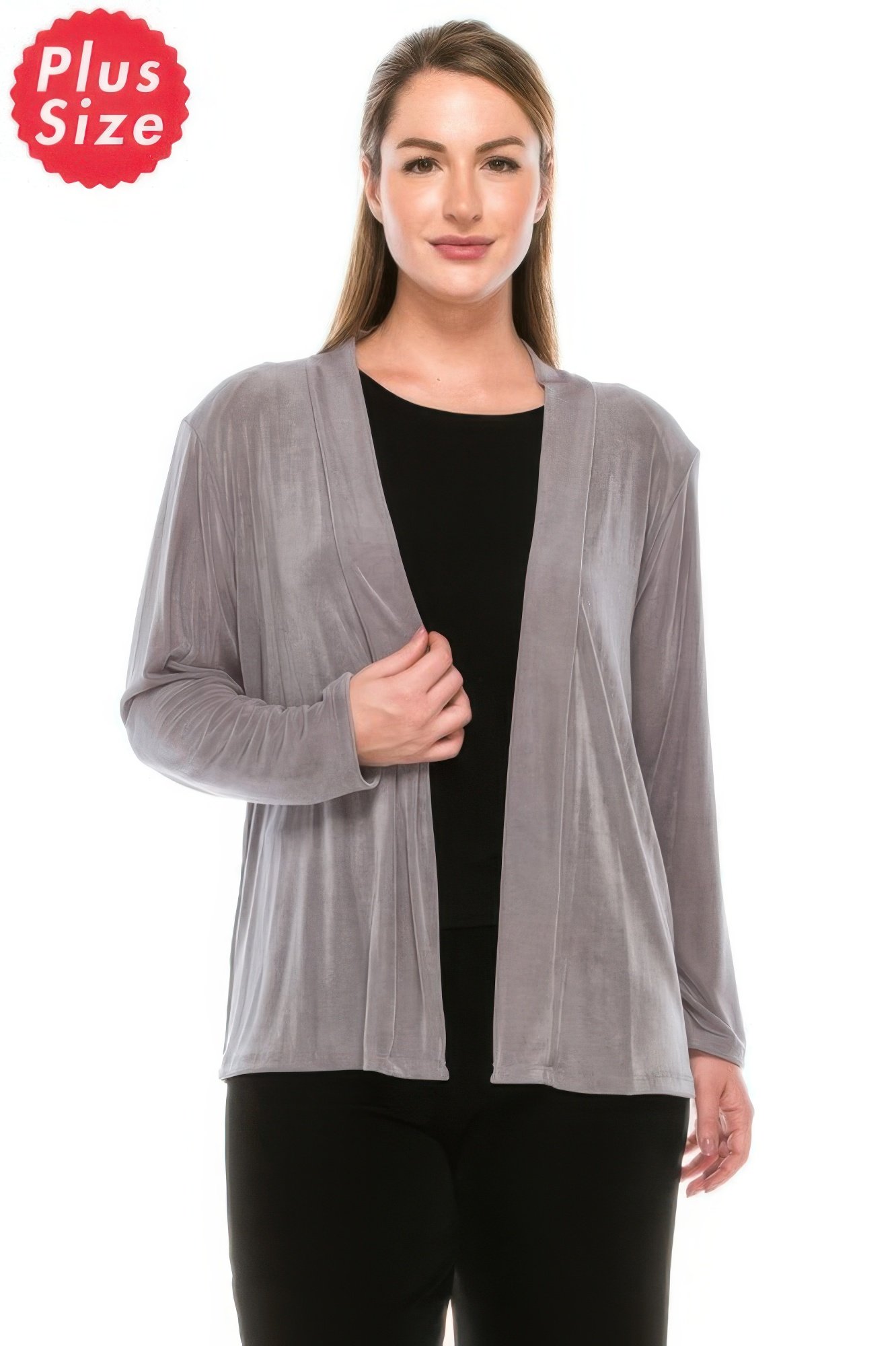 90% Acetate, 10% Spandex Long sleeve design with open front Draped silhouette for flattering layering Silky, lightweight fabric with comfortable stretch Plus size fit designed to move with you Made in the USA; machine or hand wash cold
