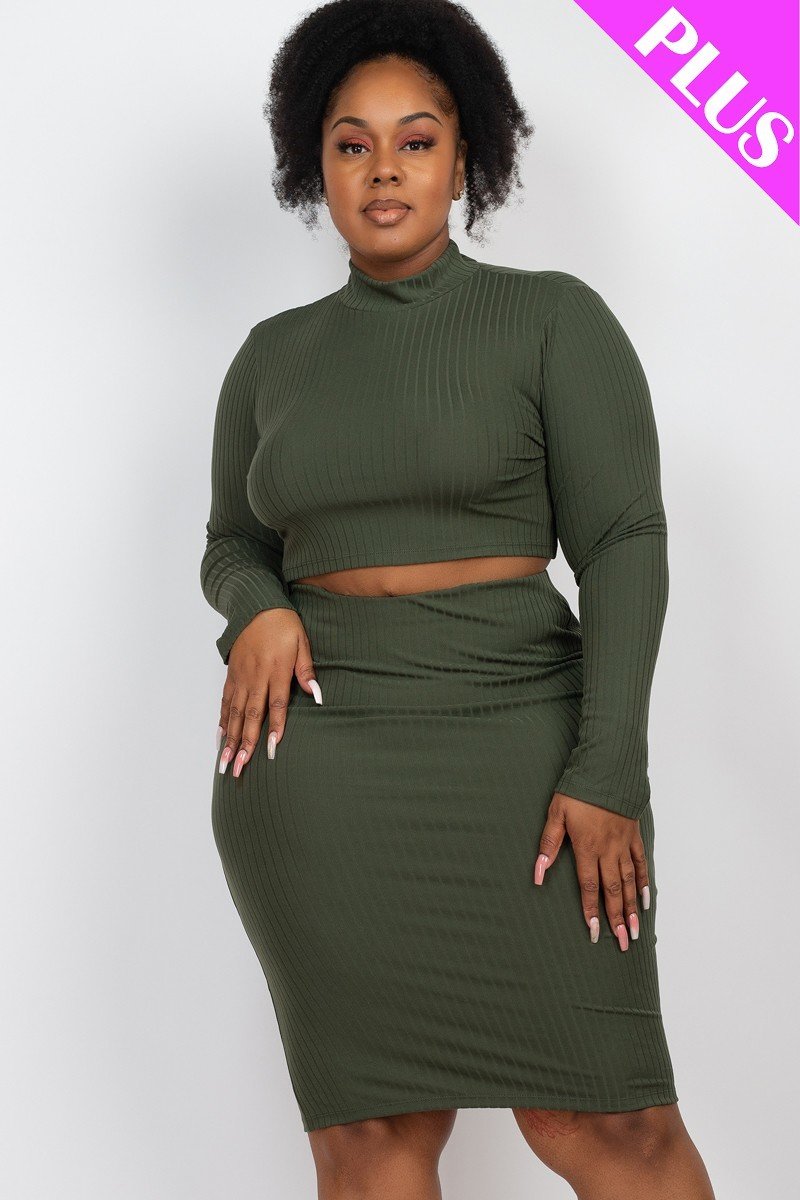 Plus Size Ribbed Mock Neck Crop Top & Midi Skirt Set