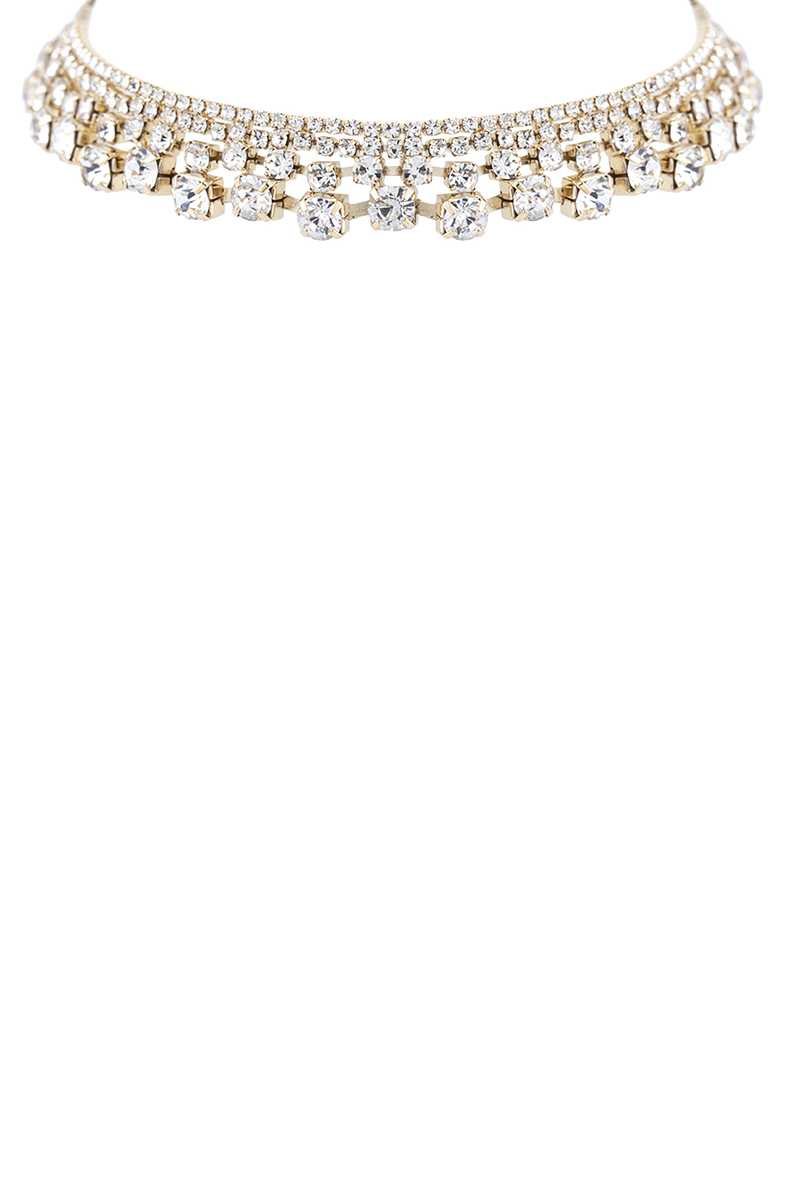 Introducing our Rhinestone 4 Line Gradual Choker, a breathtaking piece that effortlessly combines glamour and sophistication. Expertly crafted with precision, this necklace showcases the perfect fusion of gold and rhodium, creating a stunning accessory that enhances your neckline with timeless elegance.Key Features:1. Fabric: Indulge in the sparkling brilliance of rhinestones set against the radiant glow of gold and the sleek finish of rhodium, creating a truly enchanting choker.2. Fit: The 4-line gradual design offers a stylish and dynamic fit, adding a touch of glamour to your neck with each delicate line.3. Color Options: Choose between the opulence of gold or the refined allure of rhodium to match your personal aesthetic.4. Sizes: Experience a customized fit with adjustable sizing, ensuring comfort for various neck sizes.5. Design: The Rhinestone 4 Line Gradual Choker features a captivating design with four gradually spaced lines adorned with shimmering rhinestones, making it a perfect accessory for special occasions.6. Versatile Styling: Effortlessly transition from casual gatherings to formal events, as this choker complements a variety of outfits.