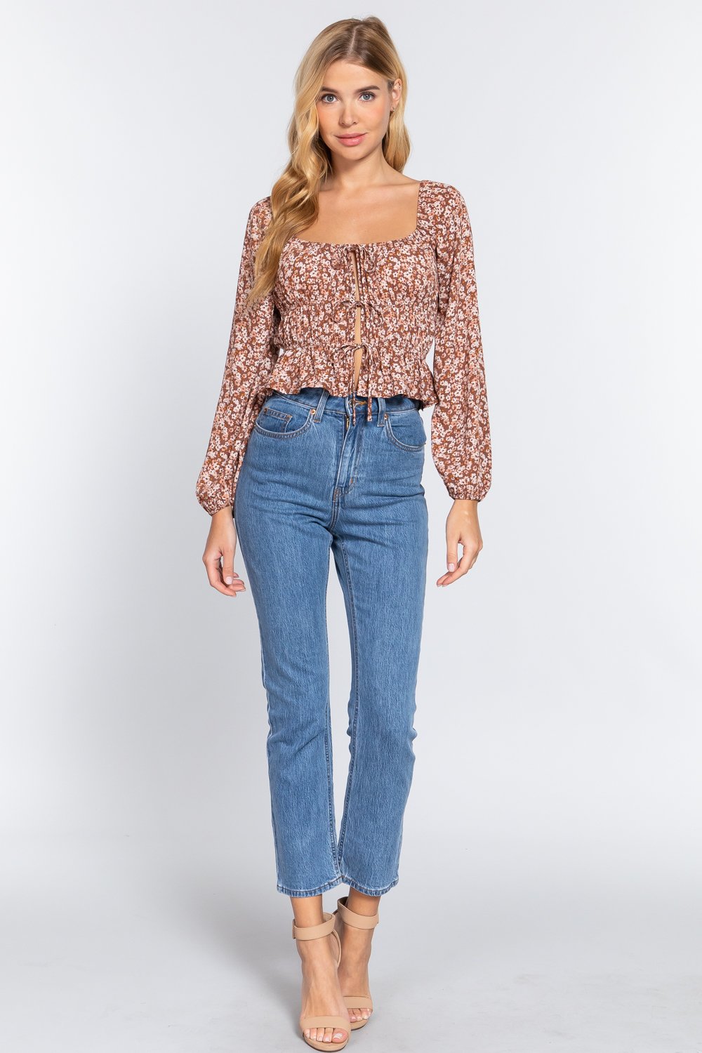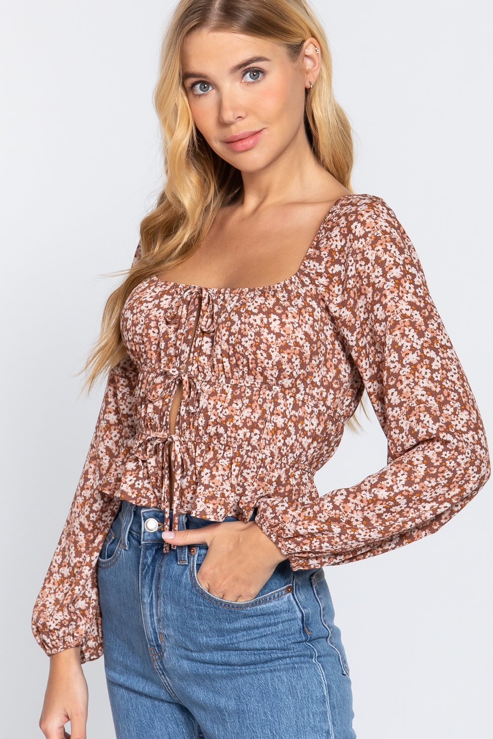 Introducing our Shirring with Ribbon Woven Top—a delightful and feminine addition to your wardrobe that seamlessly blends comfort with charming details. This long-sleeve top features a sweetheart neckline with front shirring and a ribbon tie detail, adorned with a beautiful floral print. Crafted from 100% Polyester, the Mauve hue adds a touch of elegance to this must-have piece.Key Features:1. Fabric: Immerse yourself in the luxurious feel of 100% Polyester, ensuring both comfort and a polished appearance.2. Design: Embrace the sweet and feminine aesthetic with a sweetheart neckline, front shirring, ribbon tie detail, and a lovely floral print.3. Color: Choose the elegant Mauve shade for a versatile and sophisticated addition to your collection.