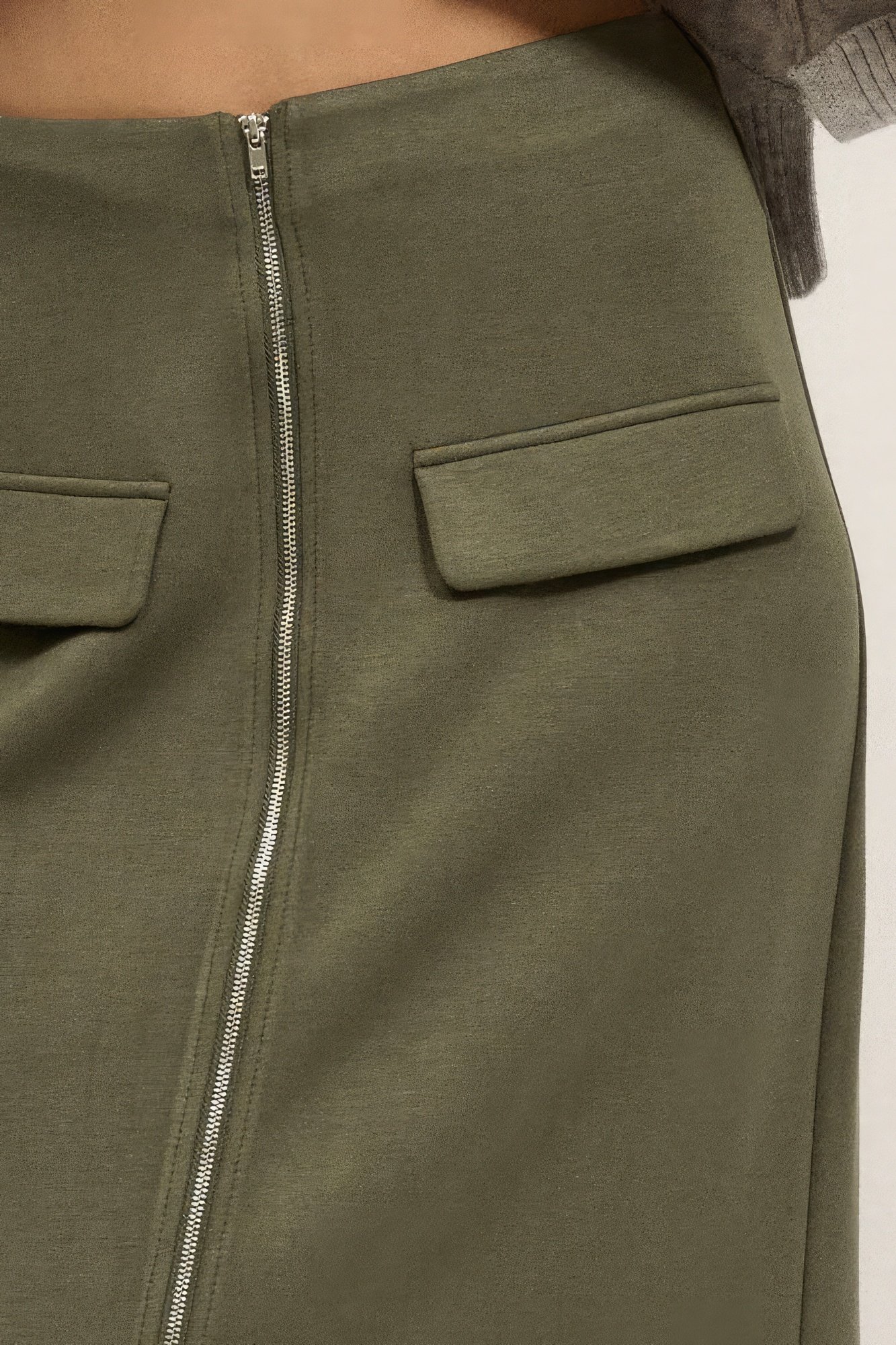 Introducing our Solid High Waist Zipper Front Slit Midi Skirt, a versatile addition to your wardrobe designed for both style and comfort.Key Features:1. Sizes: Available in Small (S), Medium (M), and Large (L) to suit a range of body sizes.2. Design: This knit midi skirt features a solid color, a zipper front closure, a stylish front slit, decorative pocket flaps, a raw edge hem, and a calf length for a chic and relaxed fit.3. Fabric: Crafted from a blend of 45% Rayon, 50% Polyester, and 5% Spandex, ensuring a comfortable and flexible feel throughout the day.4. Color: Choose the sophisticated Muted Green hue to add a touch of elegance to your ensemble.