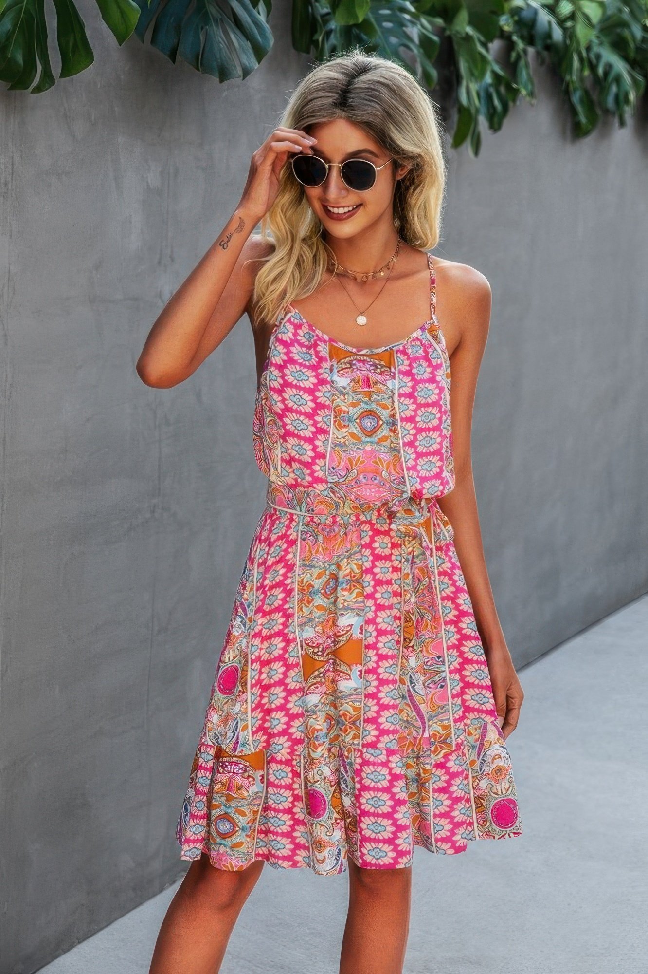 Fabric: Breathable, lightweight, soft and comfy fabric Features: Spaghetti Strap, Floral Printed, Tie Waist, Ruffle, Casual Adjustable straps for personalized fit Ruffle accents add feminine detail Ideal for beach trips or casual strolls Soft, lightweight fabric for hot days