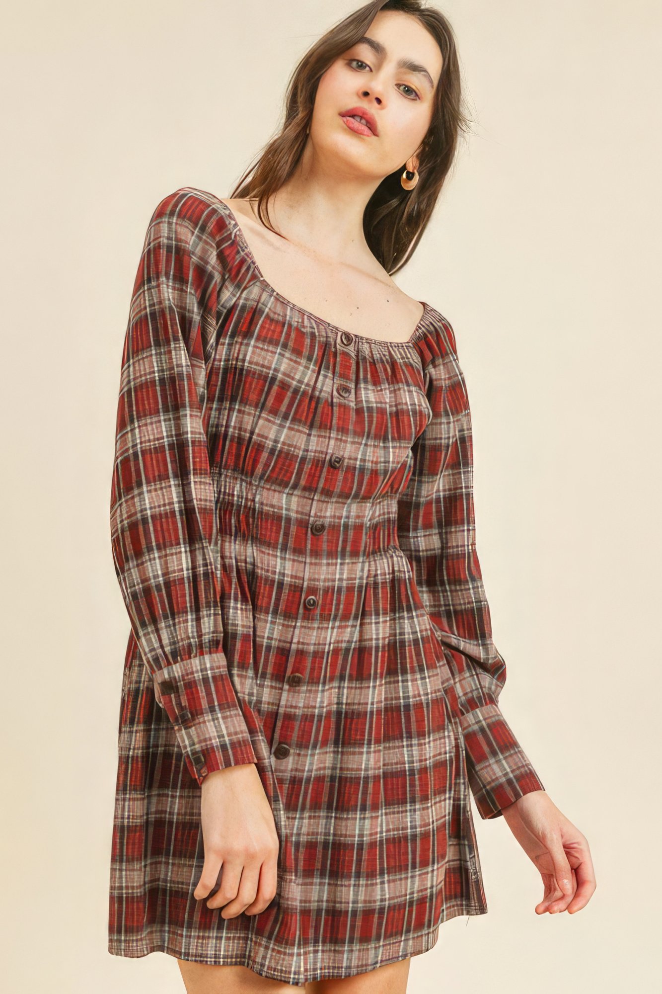 Introducing our Square Neckline Button Down Detail Elastic Waist Plaid Print Dress—a chic and versatile addition to your wardrobe. This stylish dress effortlessly combines comfort and sophistication, ensuring you look and feel your best.Key Features:1. Fabric: Revel in the blend of 90% Polyester and 10% Spandex, providing a comfortable and flexible fit.2. Sizes: Available in Small (S), Medium (M), and Large (L), ensuring a flattering fit for various body types.3. Color: Embrace the rich and stylish hues of Burgundy Multi, adding a touch of elegance to your ensemble.4. Design: The square neckline, button-down detail, elastic waist, and plaid print elevate the dress, creating a chic and contemporary look with an above-knee length.