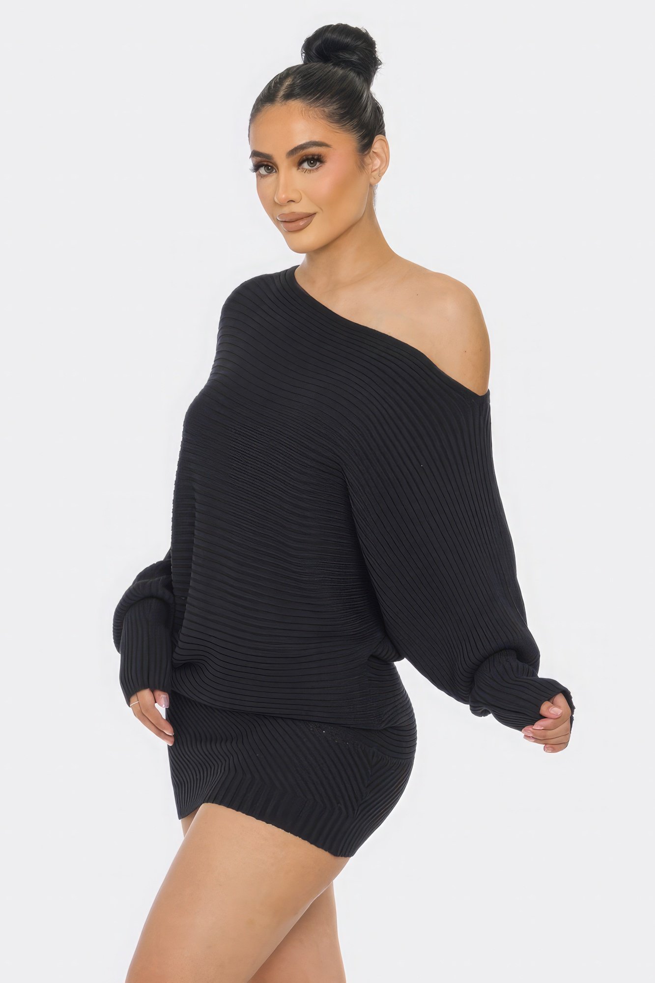 Elevate your style with our Black Off-Shoulder Long Sleeve Dress, available in sizes S, M, and L. This dress features an off-shoulder neckline, long sleeves, a loose top, and a tight bottom for a chic and sophisticated look. Crafted from 100% viscose, this dress offers a perfect combination of comfort and style with its stretchy fabric.Key Features:1. Fabric: Made from 100% viscose, our off-shoulder dress provides a soft and stretchy feel, ensuring a comfortable and stylish fit.2. Off-Shoulder Neckline: The off-shoulder design adds a touch of elegance and showcases your neckline beautifully.3. Long Sleeves: The long sleeves provide added coverage while maintaining a chic and trendy look.4. Loose Top, Tight Bottom: The loose top and tight bottom create a balanced and flattering silhouette, allowing for easy movement.