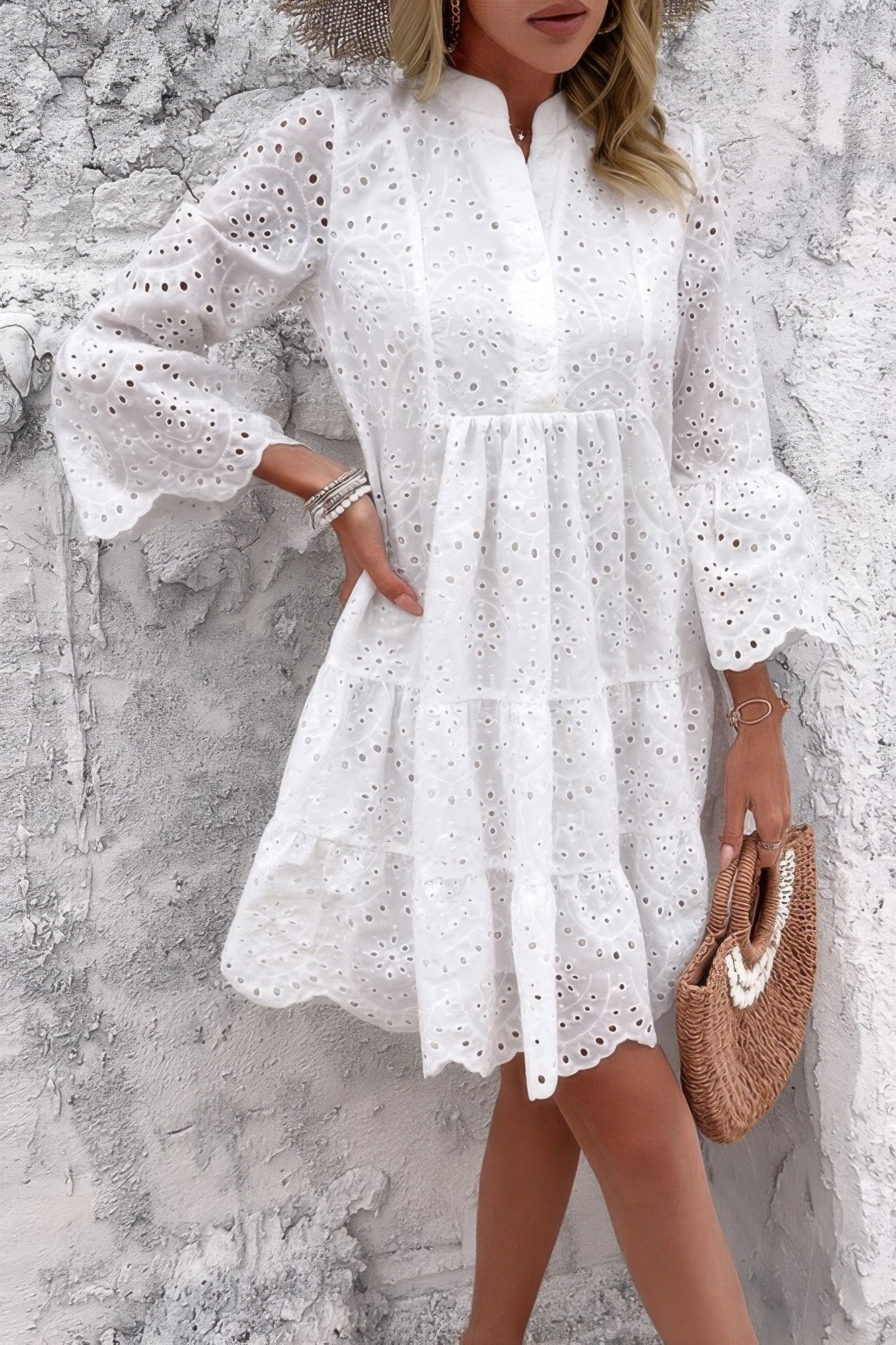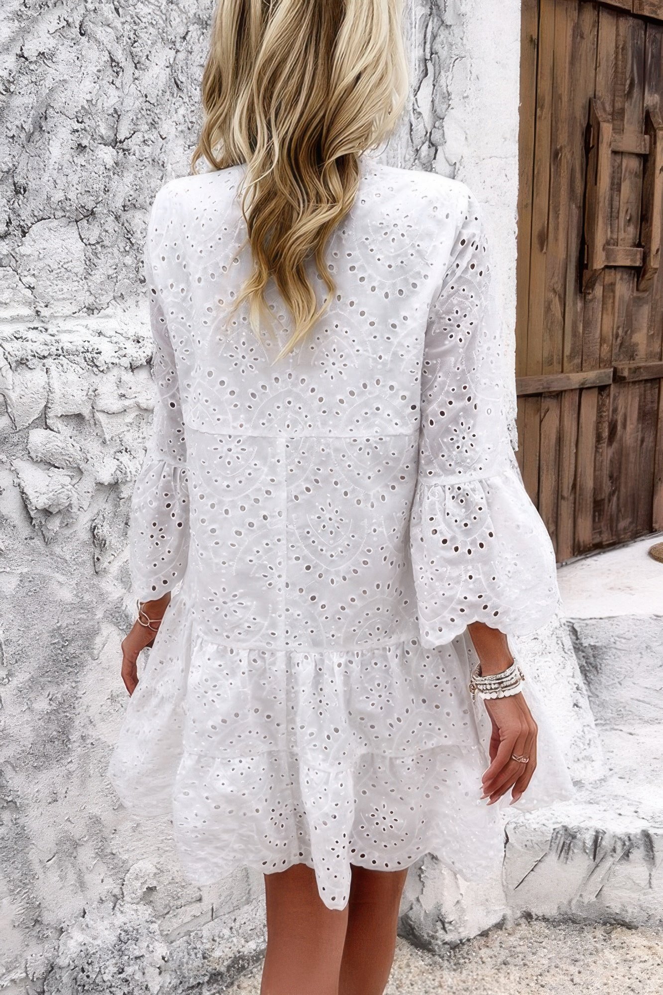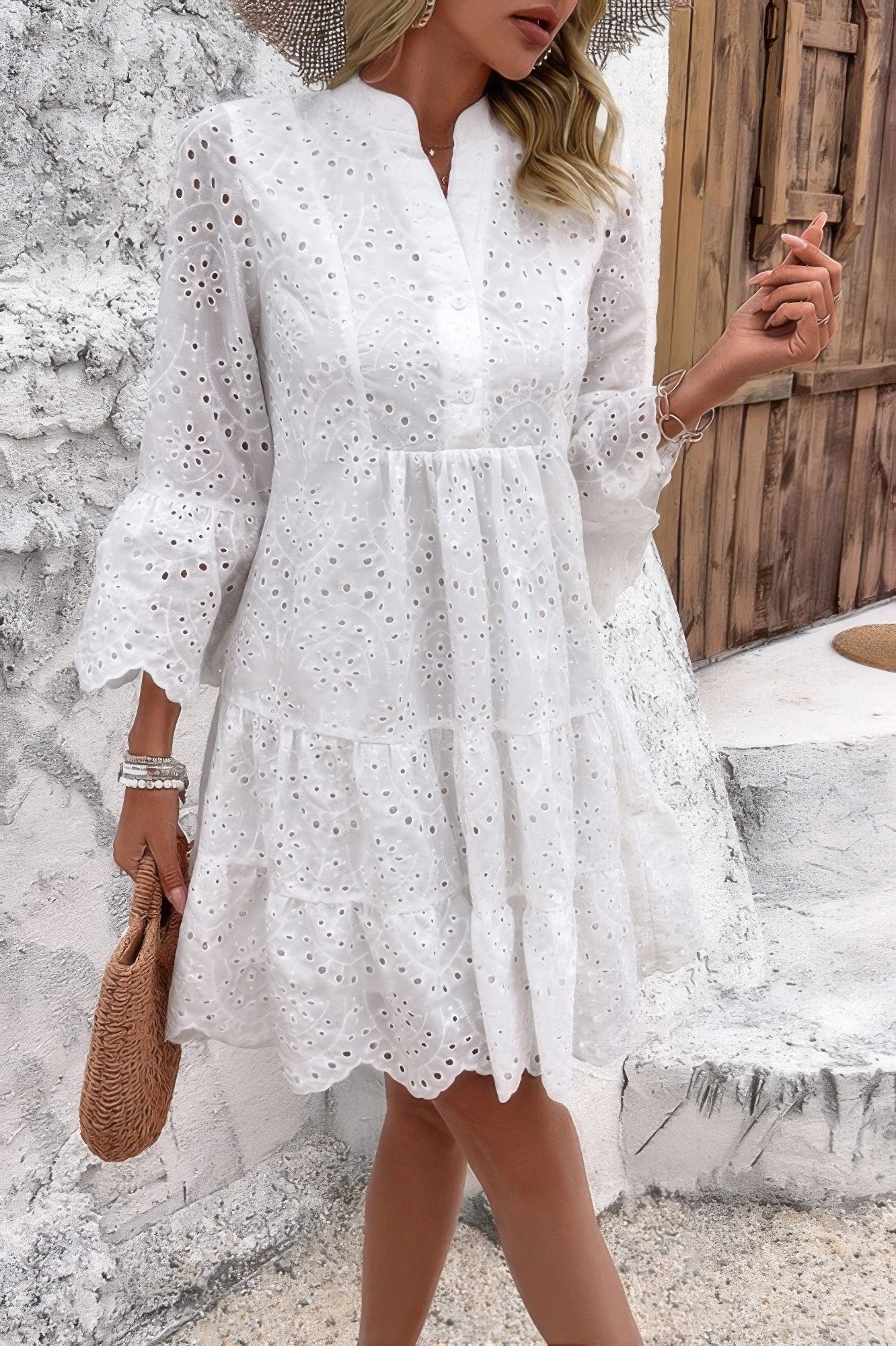 V Neck Button Flared Sleeves Hollow Out Lace Dress