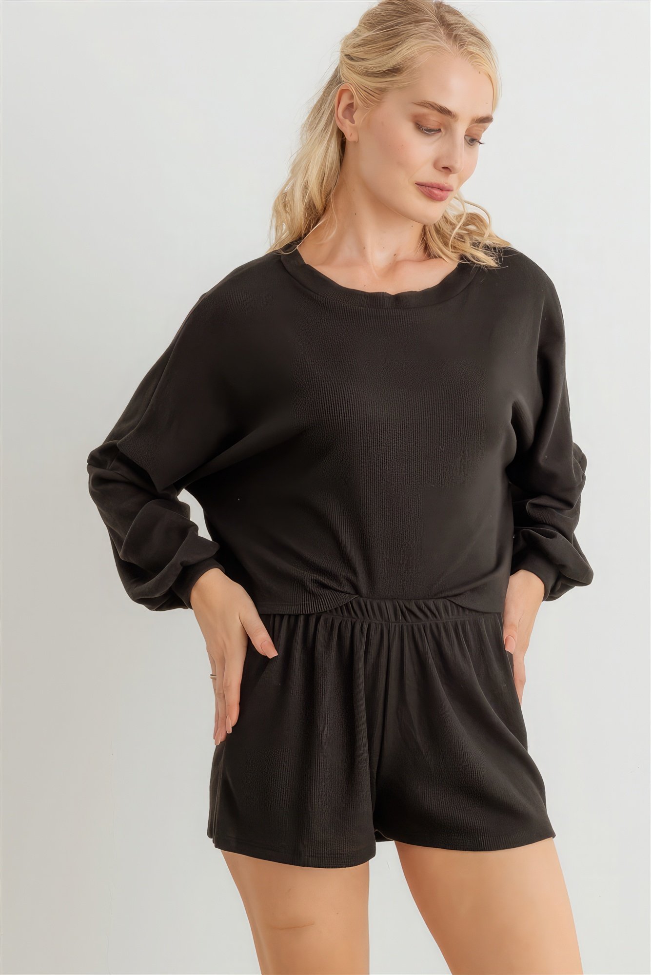 Indulge in comfort and style with our Waffle Knit Lounge Set in Black, featuring a round neckline, long-sleeve, cropped length top, and high-waist shorts. This set is perfect for both lounging at home or stepping out casually, offering a semi-stretchy feel that ensures comfort without sacrificing style.Key Features:1. Fabric: Immerse yourself in the cozy embrace of our high-quality waffle knit, crafted from a blend of 80% Rayon, 16% Polyester, and 4% Spandex.2. Fit: Available in versatile S/M and M/L sizes to cater to a range of body types, providing a comfortable and relaxed fit.3. Color Options: Choose the classic and timeless Black shade for a chic and versatile look.4. Design: The round neckline, long-sleeve top, and high-waist shorts create a cute and casual ensemble, making it the best lounge wear.5. Texture: Experience the super-soft touch of the fabric that adds an extra layer of luxury to your lounging experience.6. Versatile Styling: Transition effortlessly from relaxation to outings without compromising on style.
