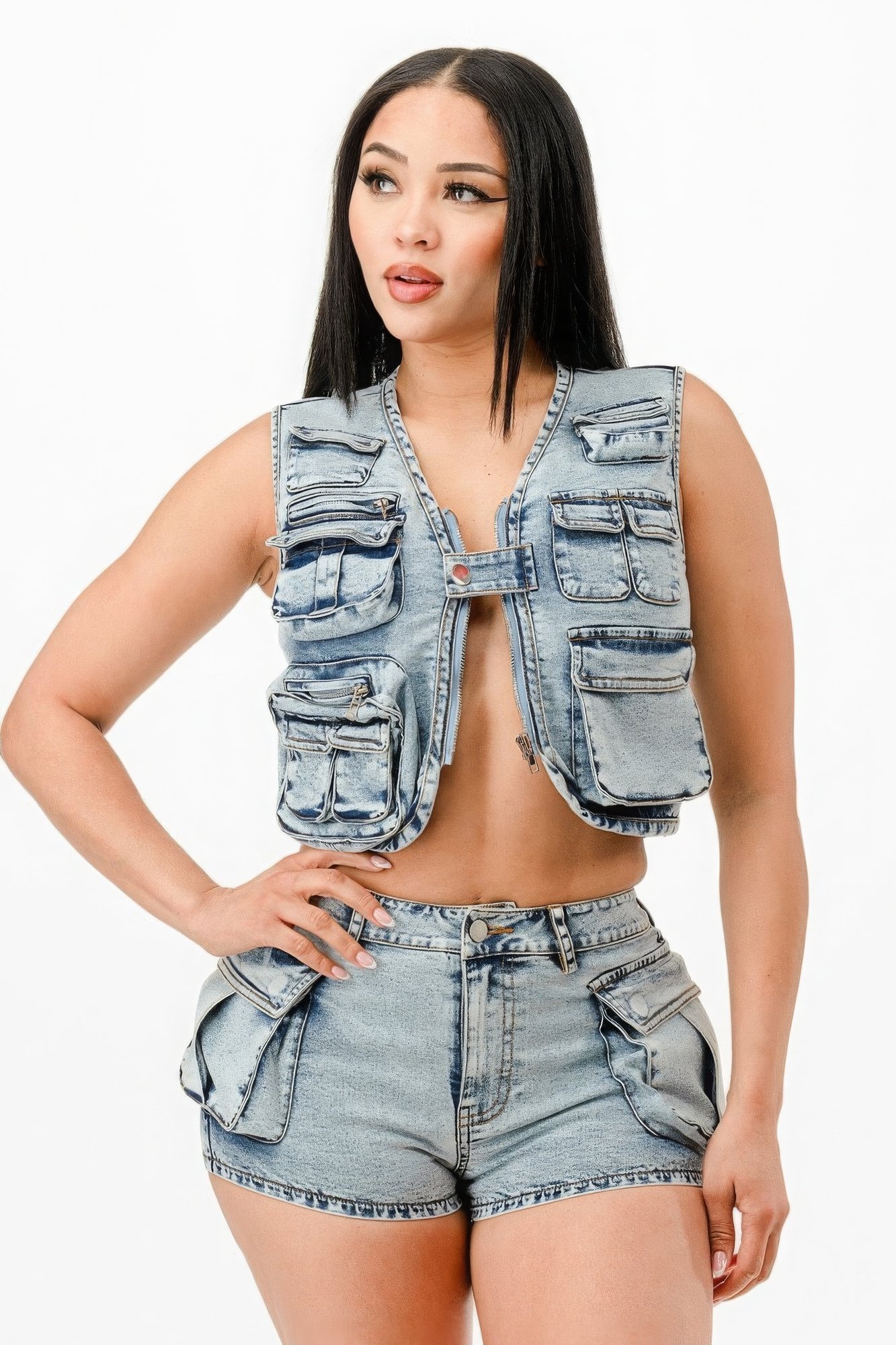 Elevate your wardrobe with our Washed Denim Two-Piece Set, a stylish and comfortable ensemble that effortlessly combines rugged charm with modern design. Crafted with the utmost care and attention to detail, this outfit is designed to make you look and feel your best.Key Features:Fabric: Made from a durable blend of 68% cotton, 30% polyester, and 2% spandex, this set offers the perfect balance of comfort, stretch, and durability.Fit: The multi-pocket vest and matching short pants provide a flattering fit that hugs your curves while allowing ease of movement.Color Options: Available in classic denim blue, perfect for a timeless look.Sizes: Offered in sizes S, M, and L, ensuring a perfect fit for everyone.Design: The set features a washed denim finish, multi-pockets vest with metal zipper and snap button closures, and matching short pants with side pockets, metal button, and belt loops for added style and functionality.Versatile Styling: Ideal for both casual and dressy occasions. Pair it with sneakers for a laid-back look or with heels for a chic, edgy vibe.