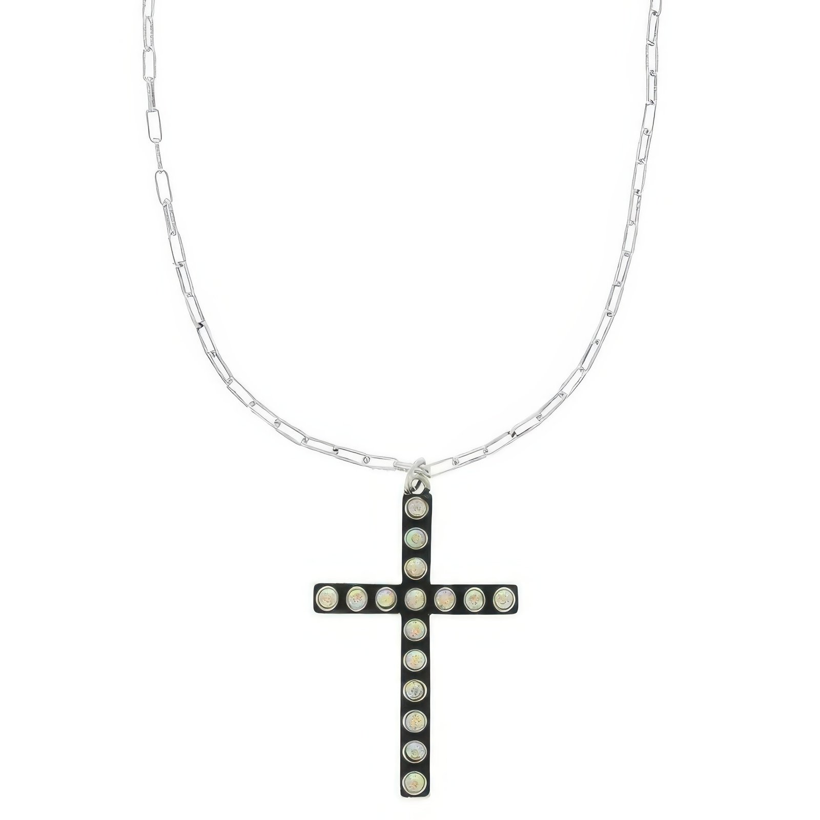 Cross pendant with jeweled bubble pattern and crystal center Oxidized silver-tone metal with ball chain Length: 17″ with 3″ extension; depth: 2.25″ Lightweight for comfortable wear Adjustable fit for versatile looks Ideal for faith-based events, rodeos, and Western gatherings