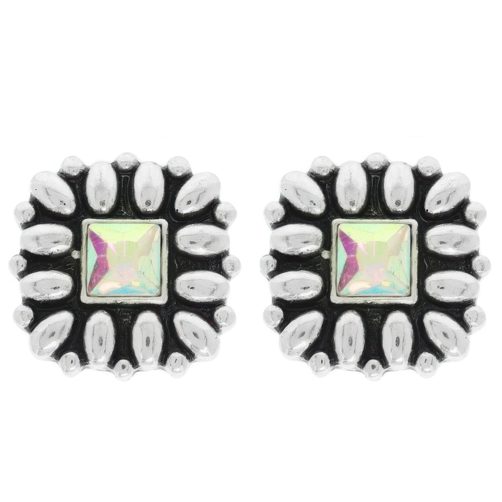 Floral square design with crystal or turquoise center Oxidized silver-tone metal with textured finish Size: 1″ height x 1″ width Secure post backing for comfortable wear Lightweight and sturdy for all-day use Ideal for Western weddings, rodeos, and casual country looks
