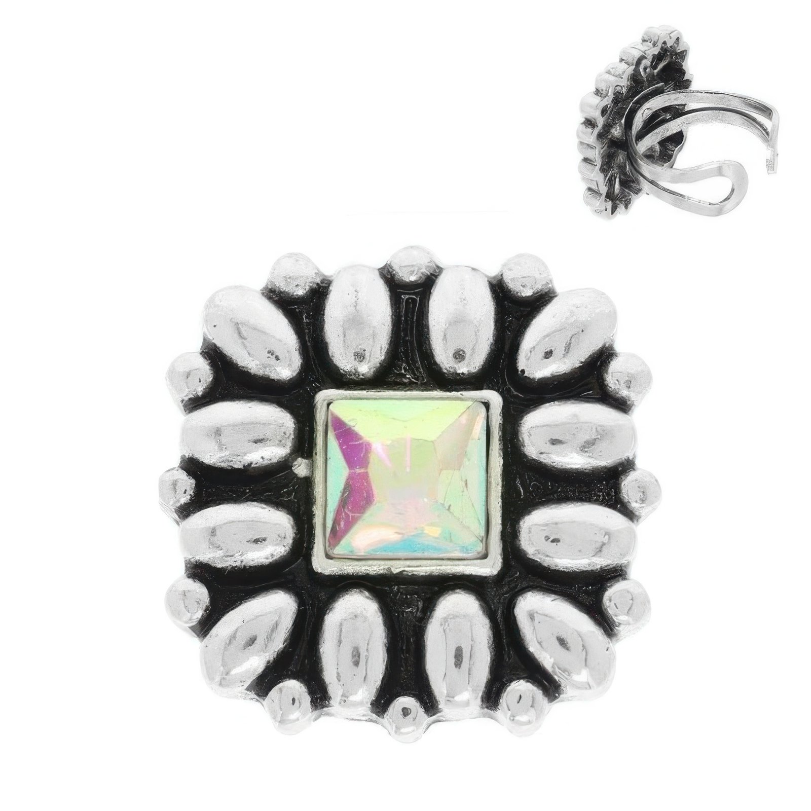 Make a bold statement with the Western Floral Square Stretch Ring, featuring a crystal or turquoise centerpiece set in oxidized silver-tone metal. The vintage-inspired floral concho design blends rustic charm with modern style. Its stretch band ensures a flexible, comfortable fit for most finger sizes. Perfect for adding a touch of Western flair to everyday outfits or completing your rodeo-ready look.