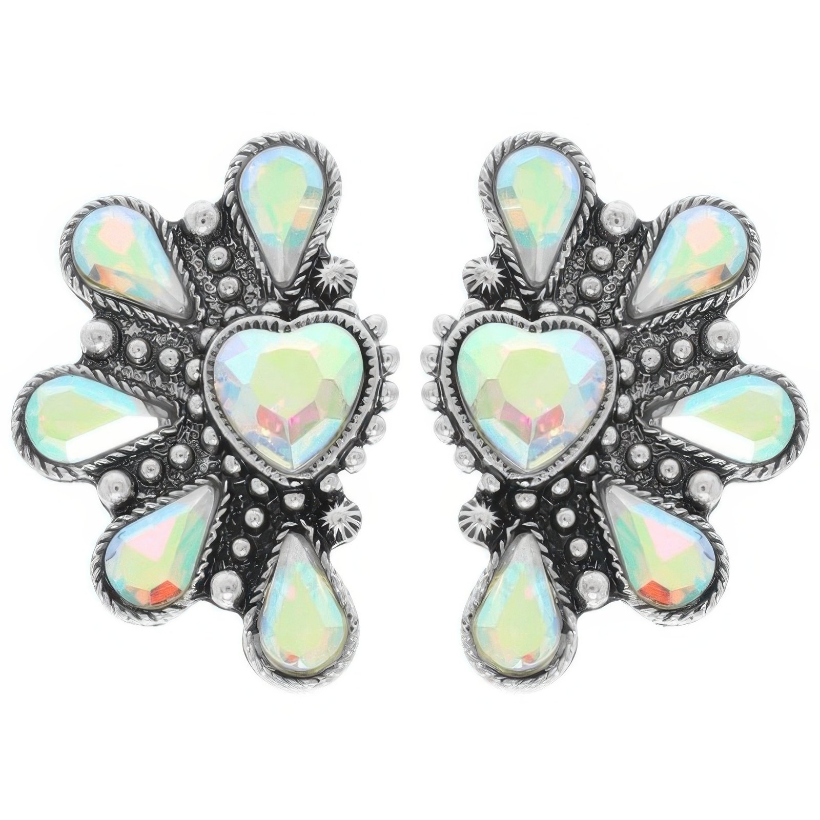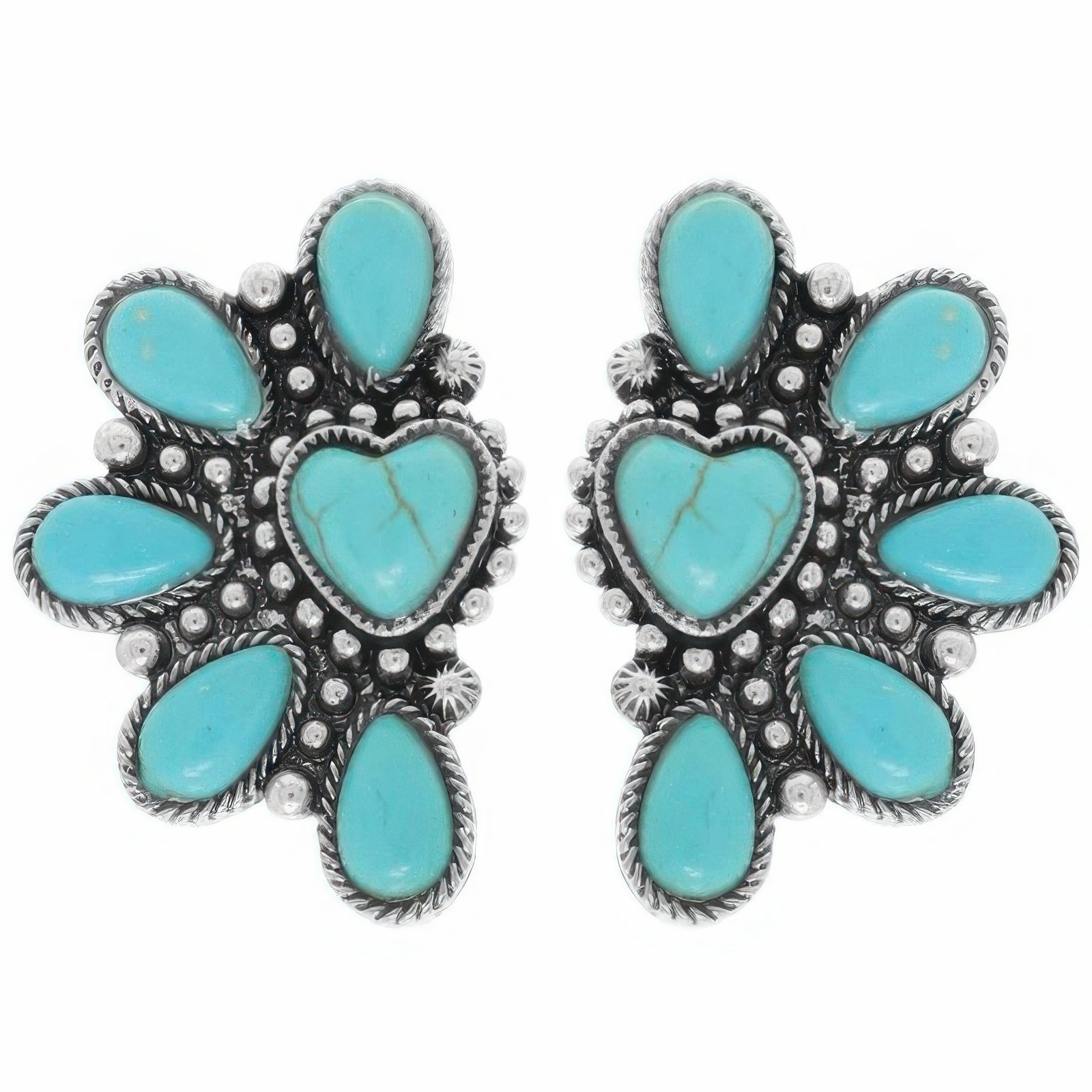 Half-heart concho design in oxidized silver-tone Choice of crystal or turquoise accents Measures approximately 1.5″ high x 1″ wide Lightweight and easy to wear Secure post back for a comfortable fit Perfect for Western and Southwestern styling