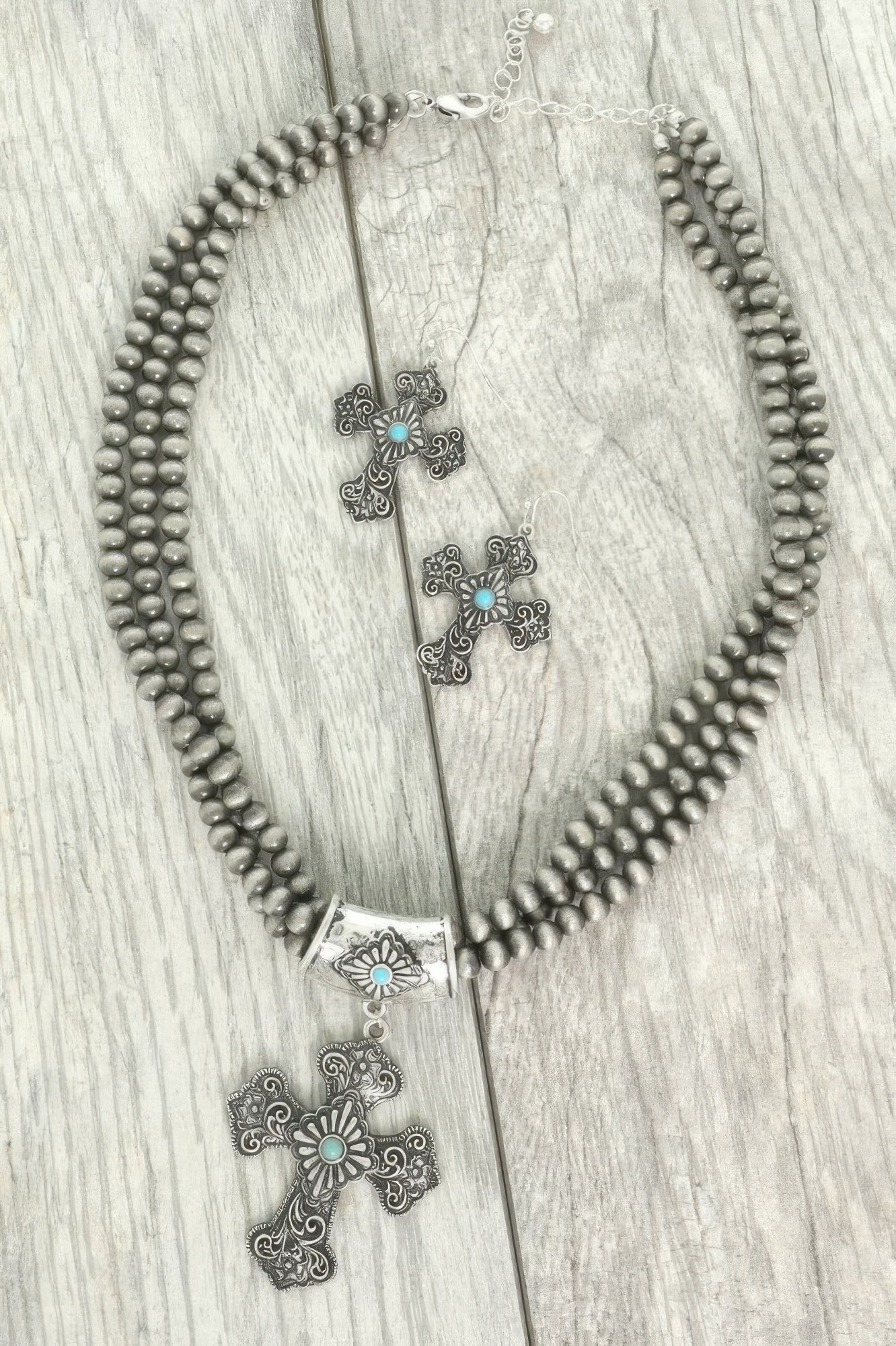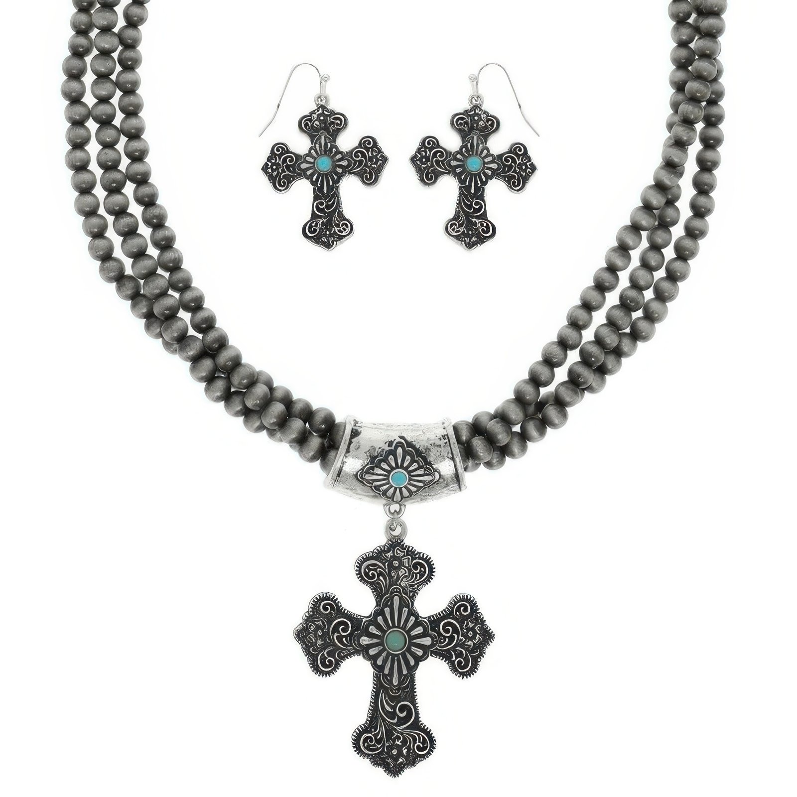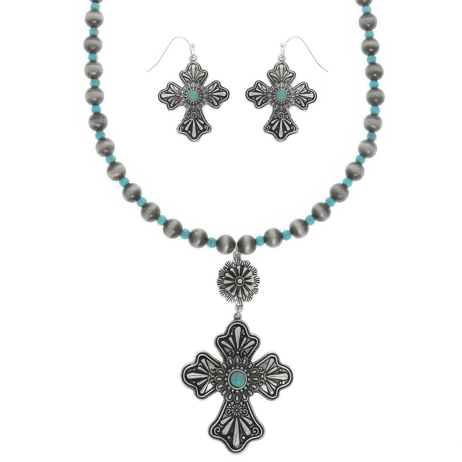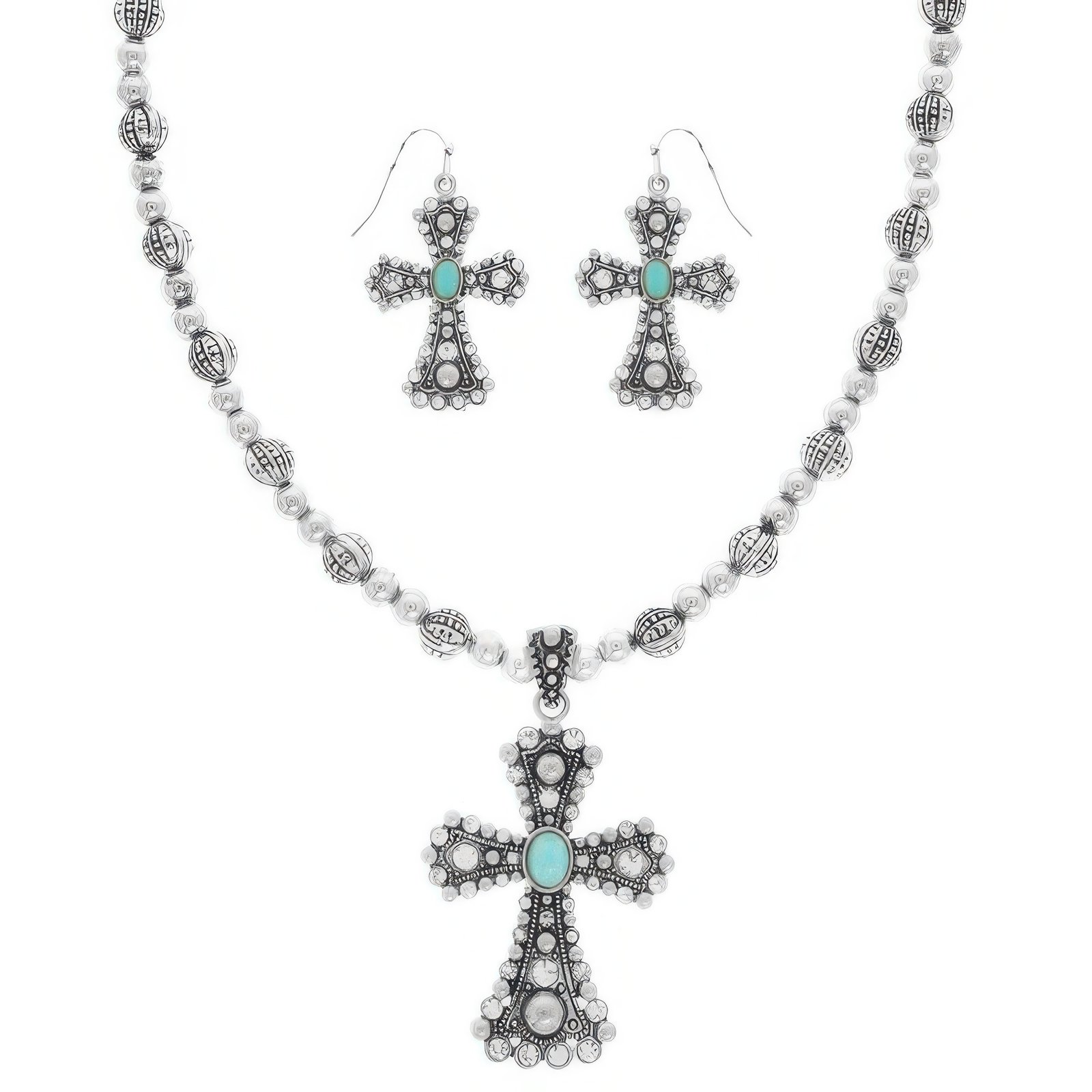 Turquoise-embellished cross pendant with matching earrings Necklace Length: 18″ + 3″ extension; Drop: 2.25″ Earrings: 1.75″ dangle style Ball-beaded silver-tone chain with rustic finish Lightweight and adjustable for comfortable wear Great for spiritual occasions, rodeos, or everyday wear