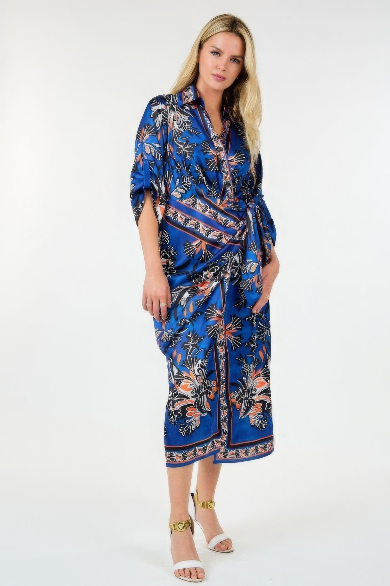 Introducing our Wrap Front 3/4 Sleeve Printed Dress, a stunning ensemble inspired by the timeless elegance of a kimono. This dress features intricate prints that drape elegantly on the body, exuding sophistication and style. The surplice neckline adds a touch of allure, while the waist tie cinches the waist for a flattering fit.Key Features:- Sizes Available: S, M, L- Design: Wrap front design with 3/4 sleeves, showcasing intricate prints reminiscent of a kimono.- Fabric: Crafted from 100% polyester, ensuring a luxurious feel and excellent durability.- Color Option: Navy/Orange, offering a striking and vibrant color combination.
