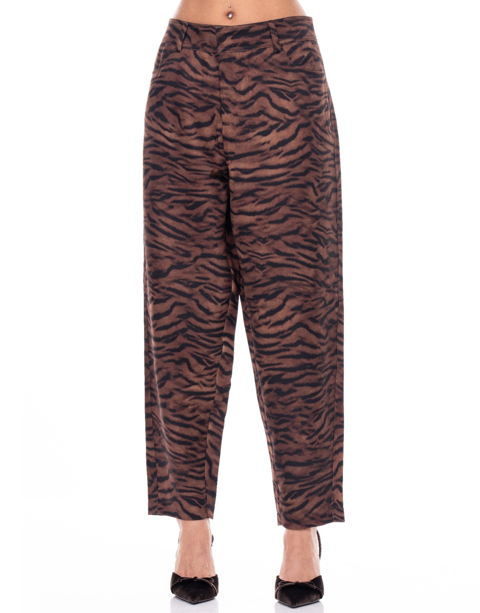 Bold and contemporary, these Zebra Print Pants make a striking statement with their dynamic allover pattern. Crafted from a soft, stretchy blend of polyester and spandex, they offer a flattering fit that moves with ease. The eye-catching zebra print adds a fashion-forward edge, perfect for elevating casual outfits or completing a standout look. Whether styled with a crisp white shirt or a sleek black top, these pants bring energy and confidence to any ensemble. Imported and designed for comfort with impact.